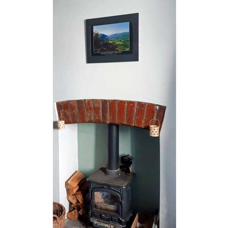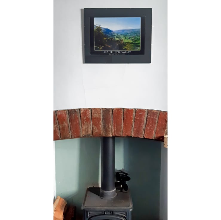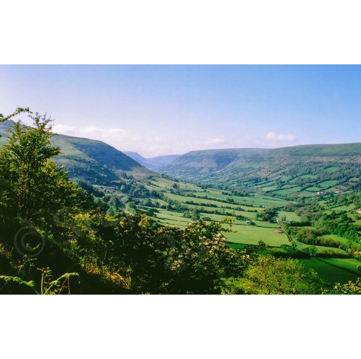 A spring time image of the Llanthony Valley in the Black Mountains in Wales, part of the Brecon Beacons National Park. We're looking up towards the source of the river Honddu, with hawthorn in blossom in the foreground. A lovely print for anyone that enjoys spending time in the mountains, could also be a perfect picture for your holiday cottage.