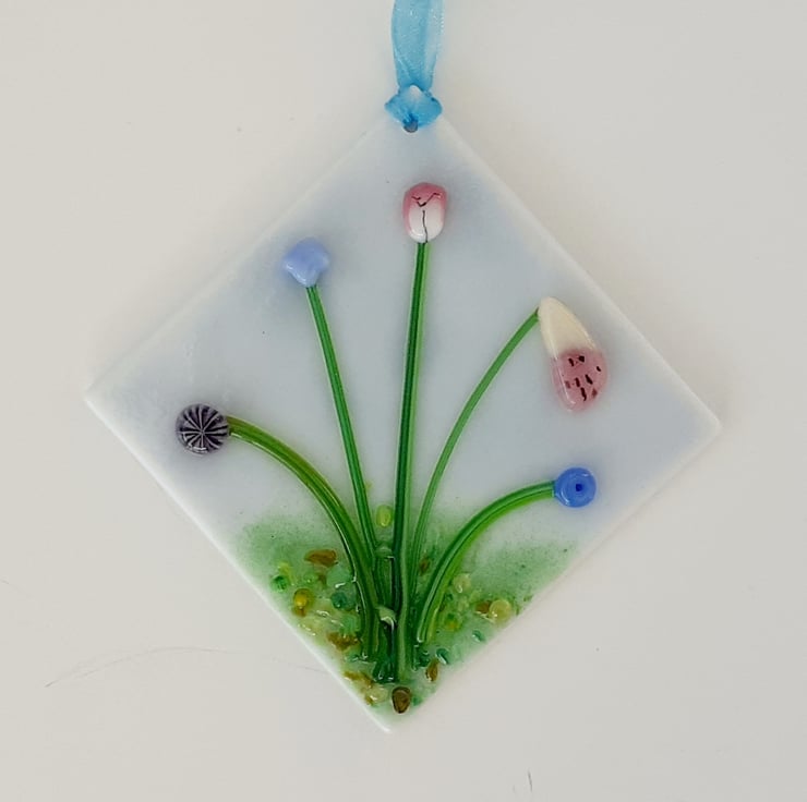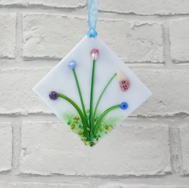Fused glass miniature hanging decoration depicting a selection of flowers in blue and purple shades, which would make a lovely little keepsake gift.