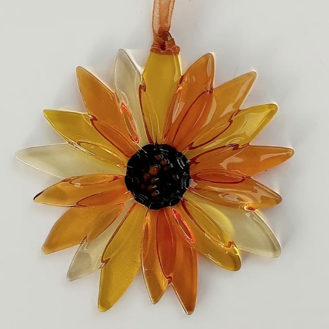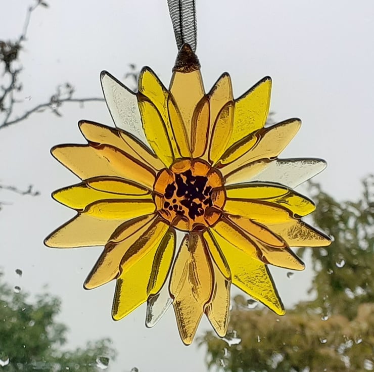 A fused glass sunflower suncatcher/mobile/wall hanging, handmade in my garden studio. The petals are in yellow and three shades of amber transparent art glass and each has been individually hand cut and then ground to a smooth finish. The central disc was sprinkled with finely crushed glass to represent seeds. The whole piece was then fused together at 745°C, a temperature which fuses the separate pieces together, but retains texture in the layers of petals.