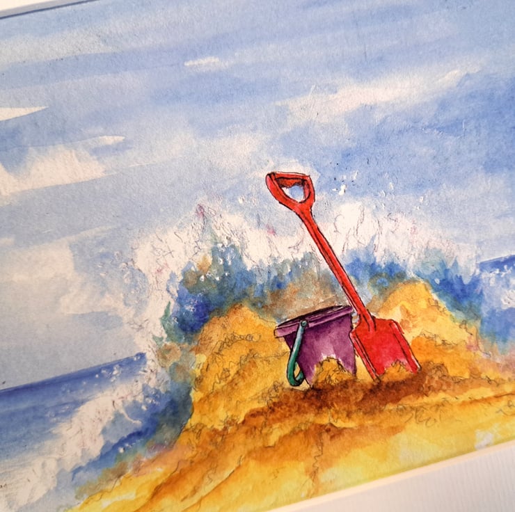 An original illustrated watercolour print of a Sandcastle on a Cornwall Beach. Presented and signed in a mounted Grey wooden frame with a grain finish 10" x 8" (print: 8" x 6") 22mm wide and 22mm deep. Also presented unframed, fully mounted ready for your own frame. (10" x 8" Mount-Print 8" x 6")