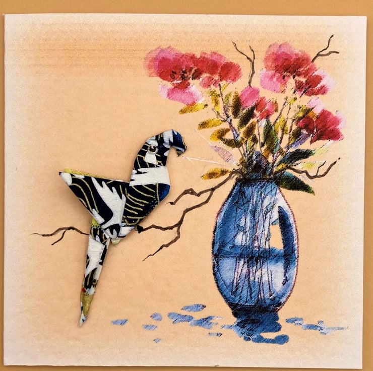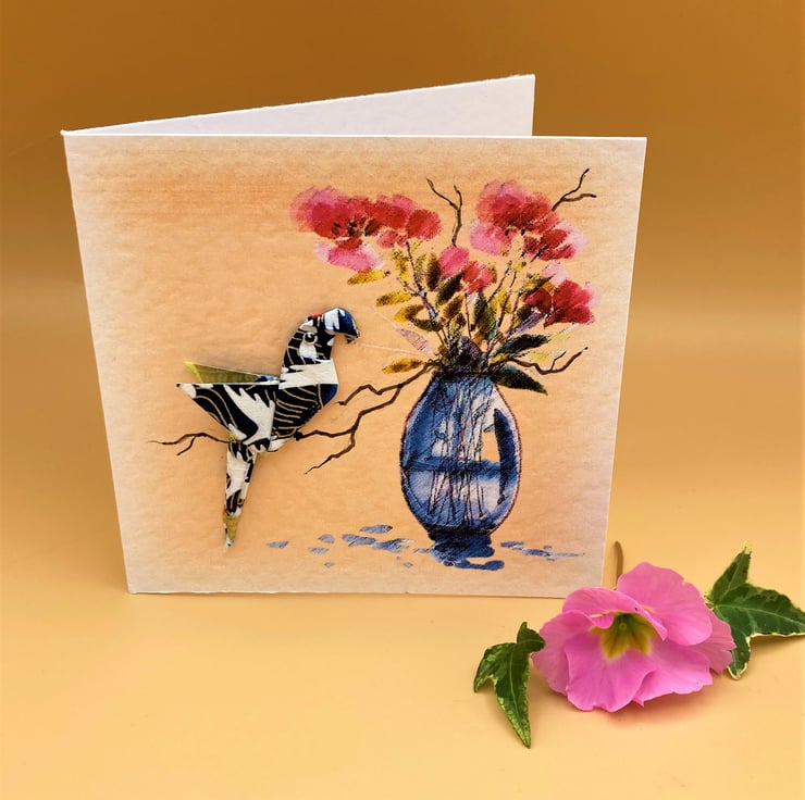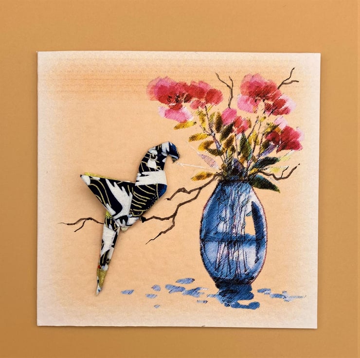 This blank Greetings Card shows a colourful hand folded Origami Parrot firmly attached to a pretty floral card. The background print design is taken from one of my original watercolour paintings and enhanced with hand drawn detail. I make the origami parrots from carefully chosen Japanese paper so no two parrots are ever the same, each little card is truly a 'one of a kind original'. These unique cards take time to make but they're perfect for special occasions.