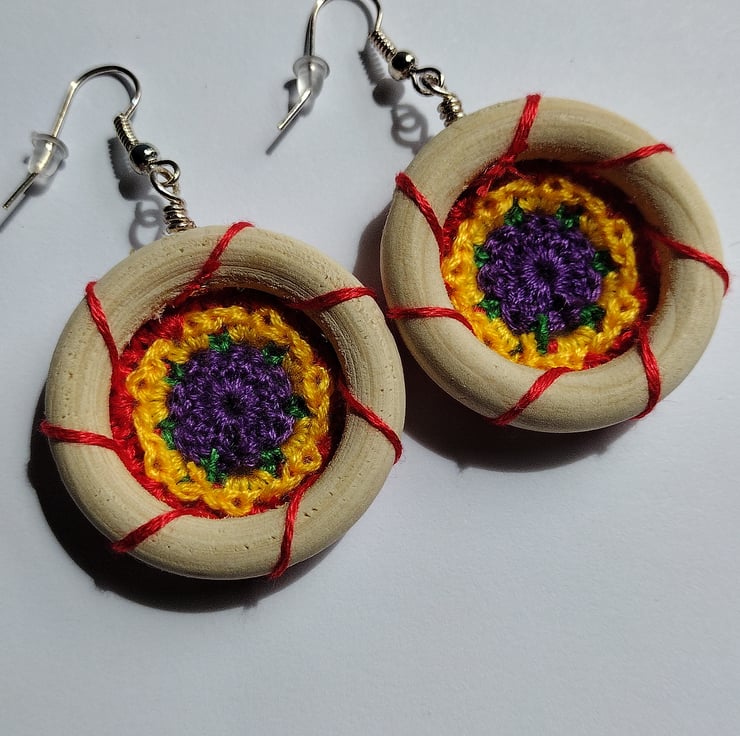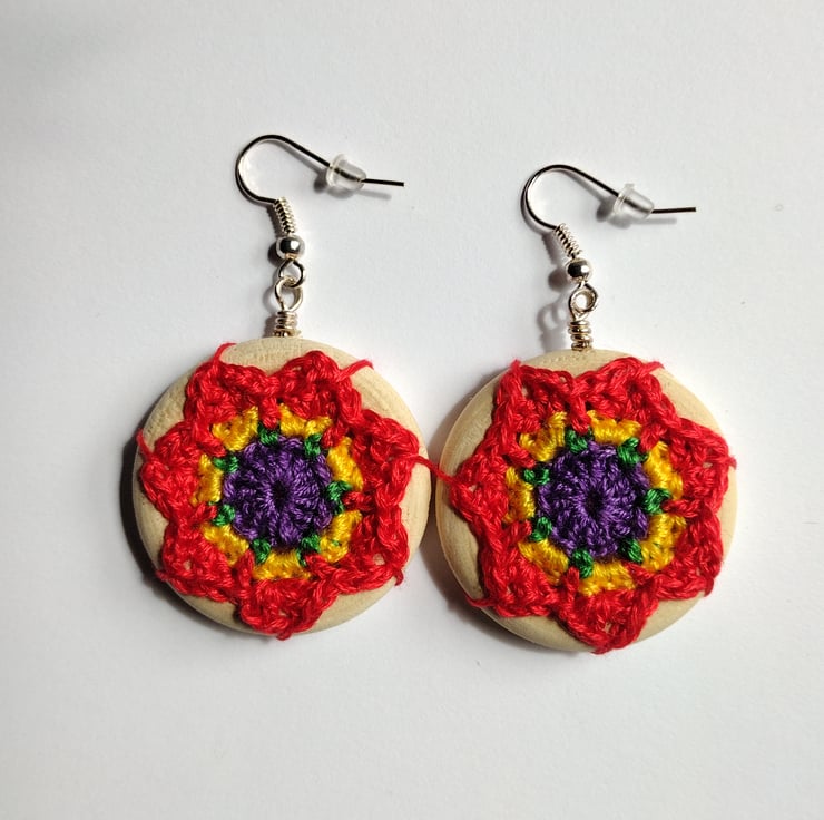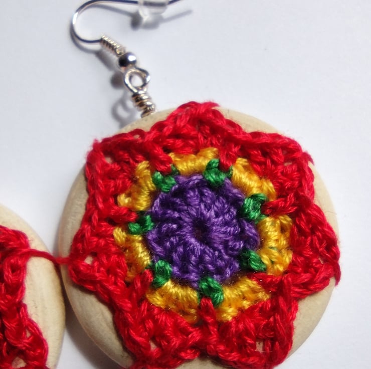 Each earring consists of a mandala in colours red, green, yellow and purple, which is mounted onto a small wooden hoop. A small hole has been drilled into the wooden hoop to allow the earring hook to be fitted, and to allow the mandala to hang freely. (The back is shown in the photos).