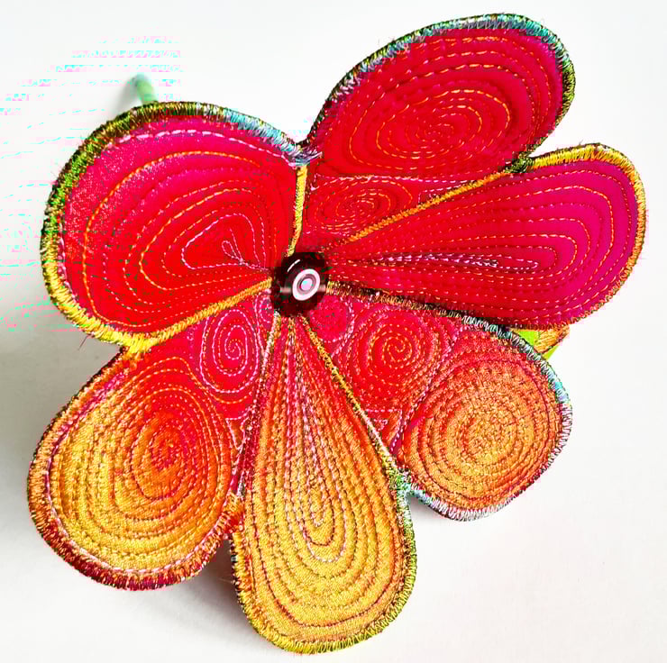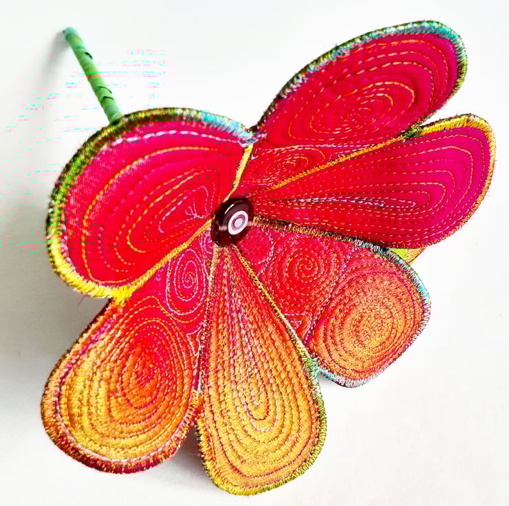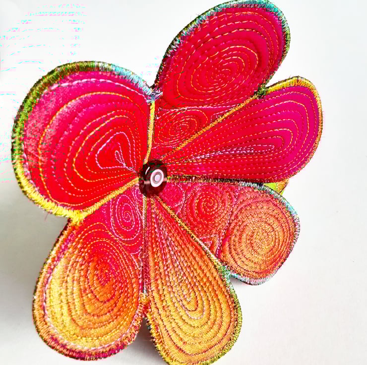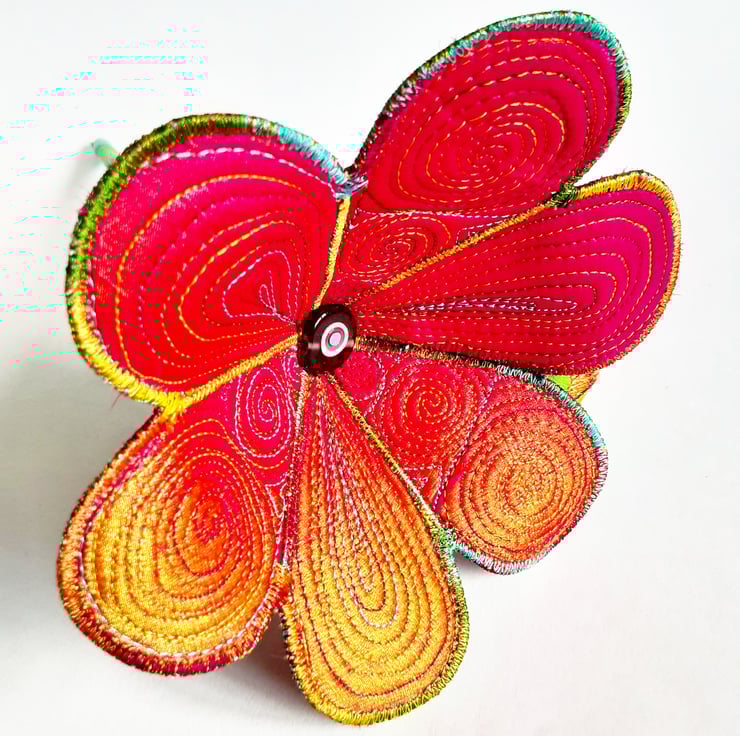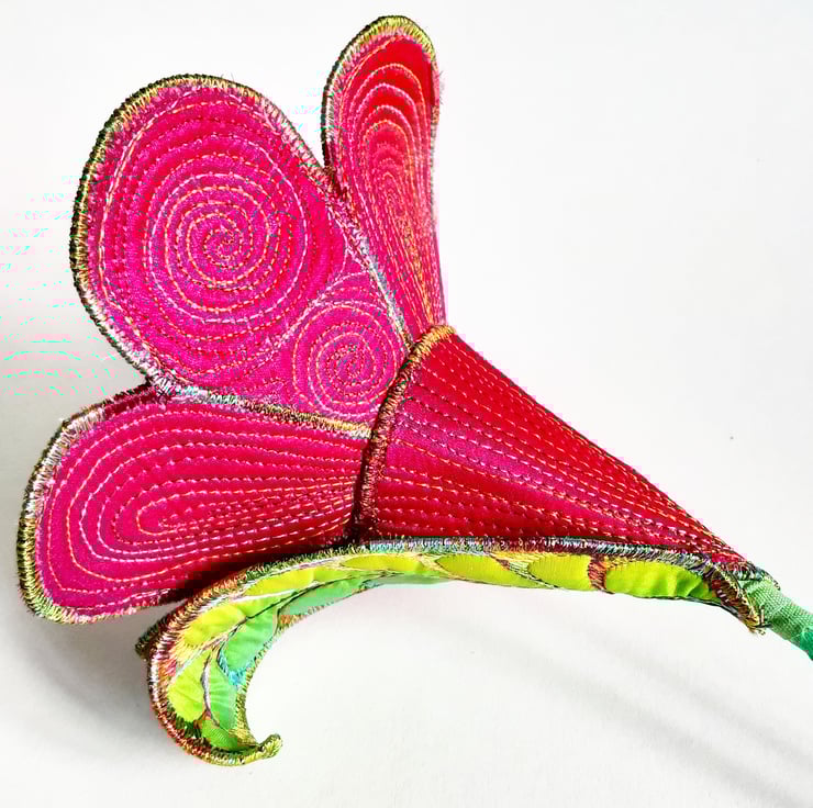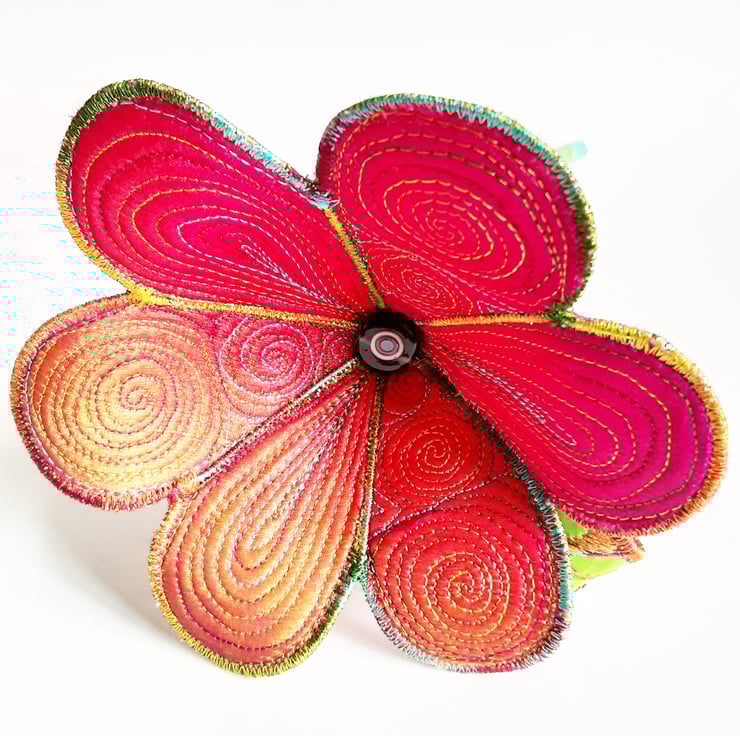 Made from layers of fabric including hand dyed Egyptian cotton and silk fabrics using the free machine embroidery style of sewing