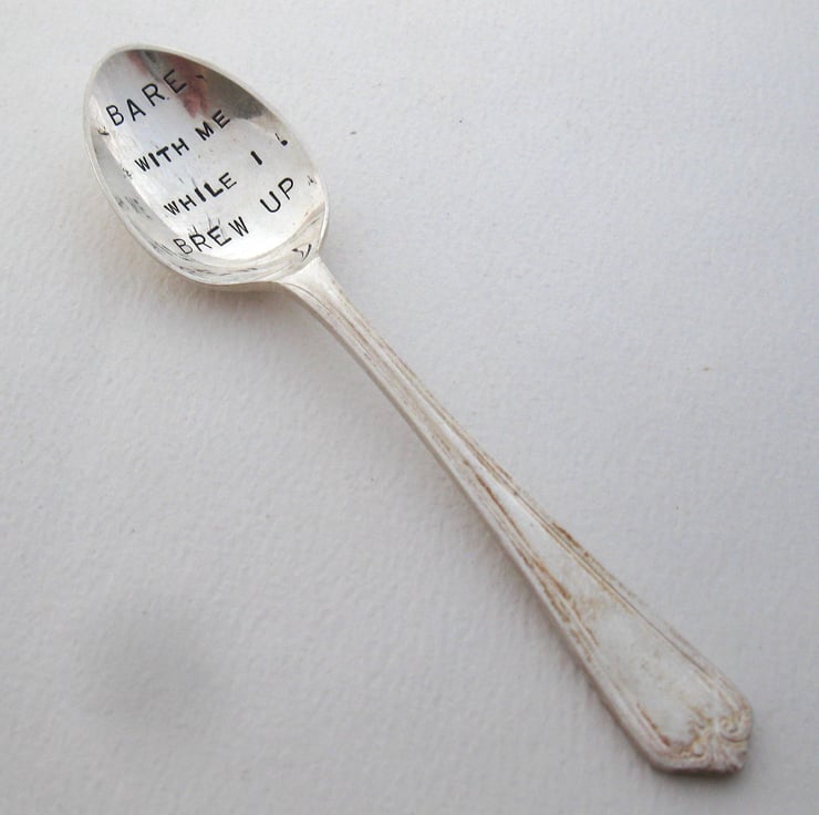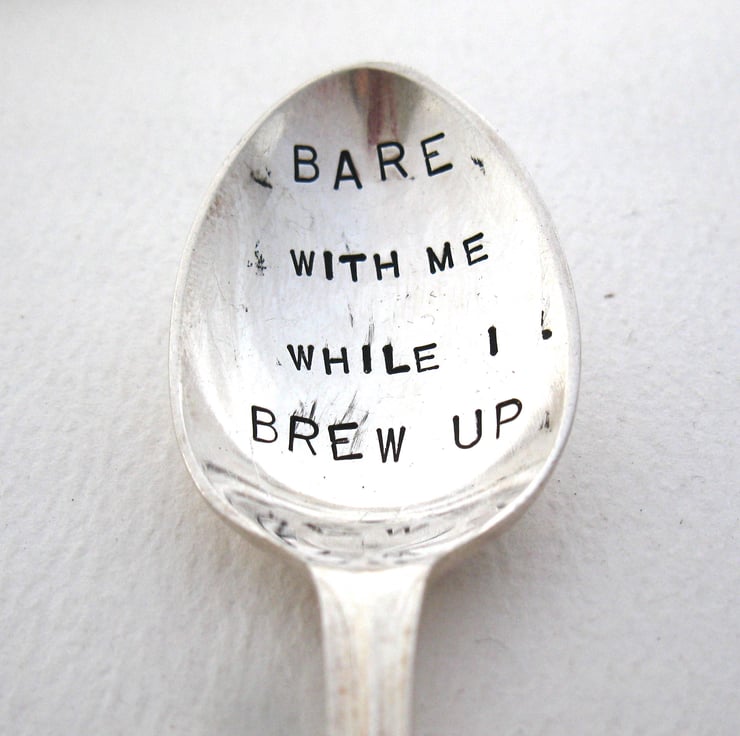 A small coffee spoon hand stamped with BARE WITH ME WHILE I BREW UP. Perfect gift for a naturist, or an addition to your own camping kit, campervan kitchen or caravan cutlery drawer. It's a small (11.5cm) spoon with a pretty little scroll detail on the handle. The design was registered in 1924 so it may even be an antique by now!
