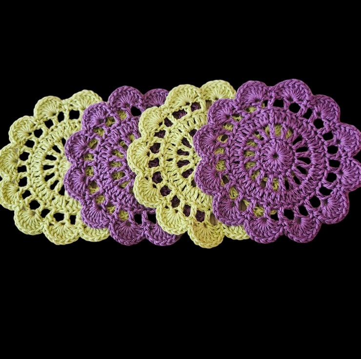 This beautiful set of purple and green coasters are made with 100% cotton yarn. They measure 5 Inches (13 Centimetres) across and would be a lovely addition to any home or garden.