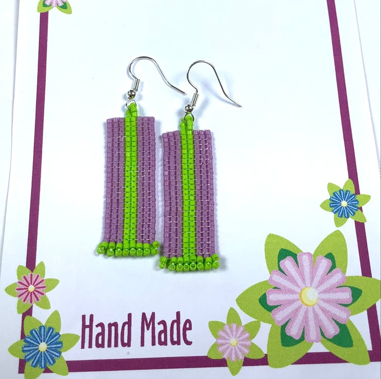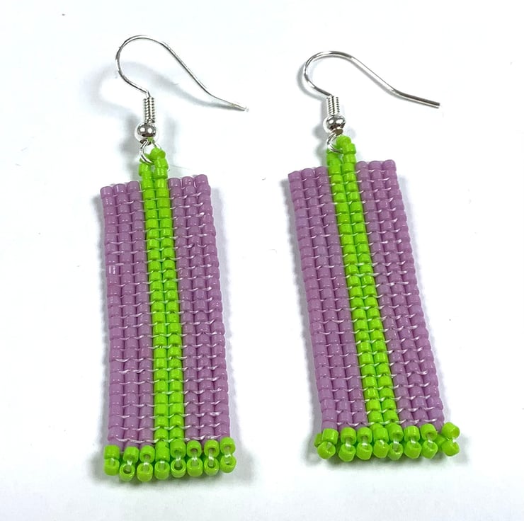 Hand beaded earrings using opaque Delica beads in shades of lilac and lime green.