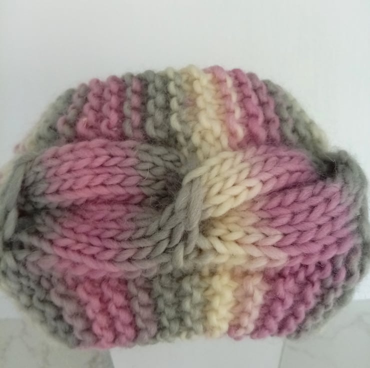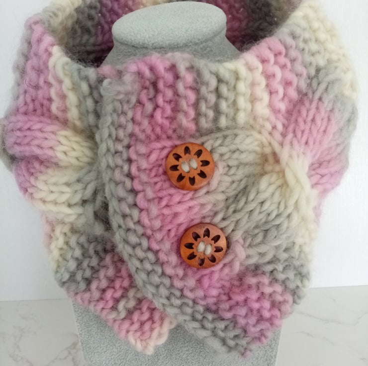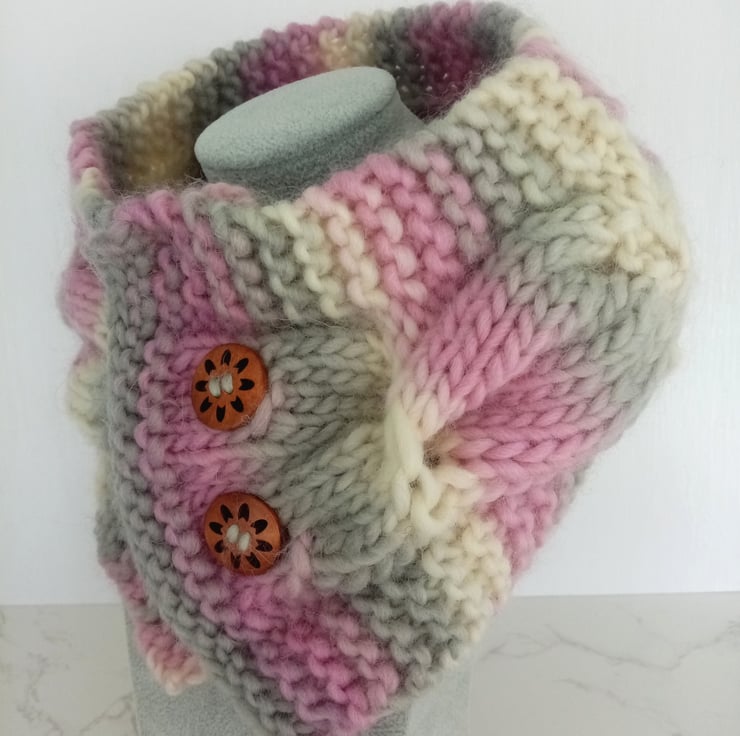 Cable knit neck warmer in a soft misty pink, grey and cream with wooden flower button closing.