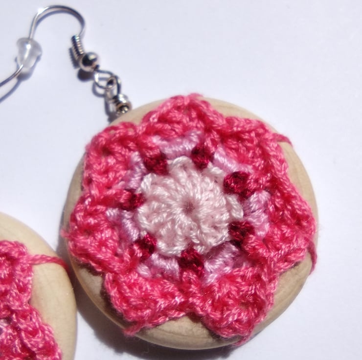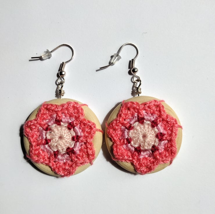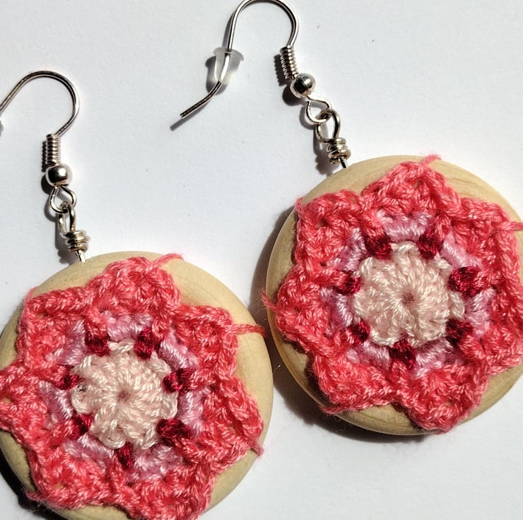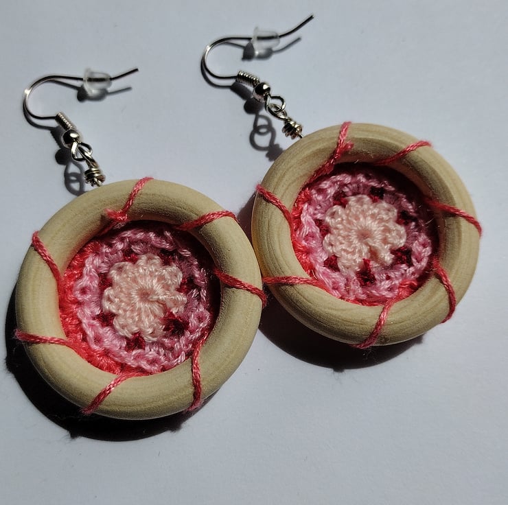 Each earring consists of a mandala in various shades of pink, which is mounted onto a small wooden hoop. A small hole has been drilled into the wooden hoop to allow the earring hook to be fitted, and to allow the mandala to hang freely. (The back is shown in the photos).