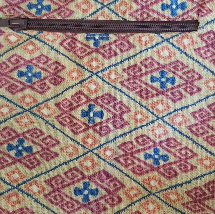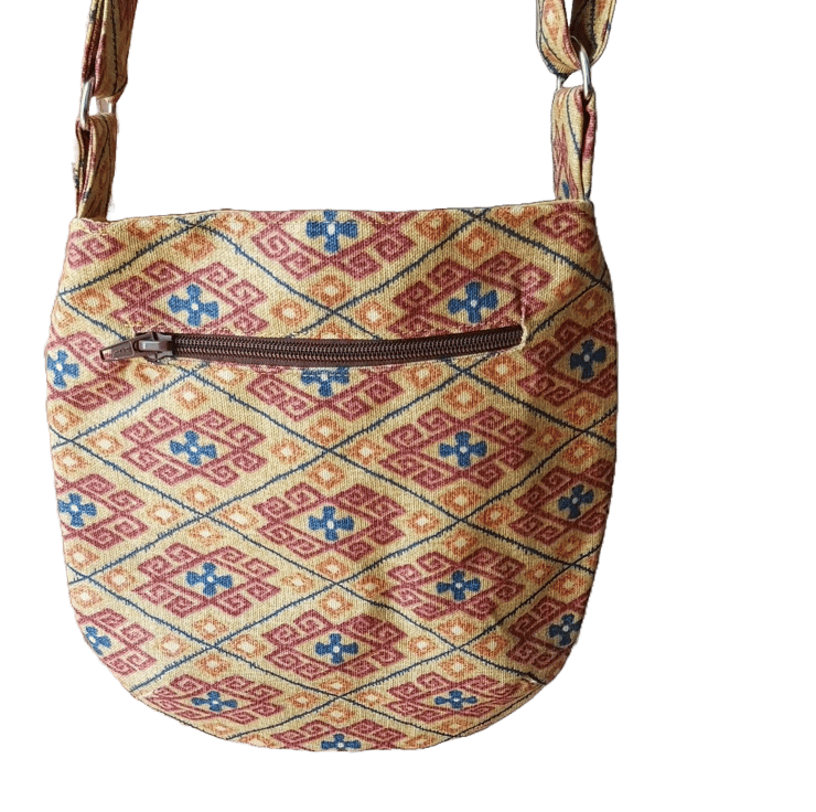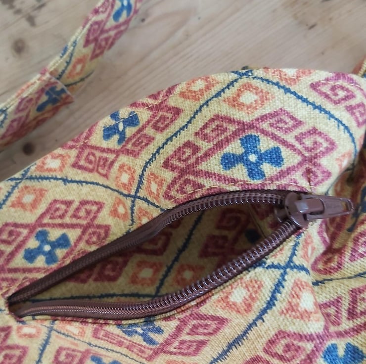 Made strongly with rescued repurposed upholstery furnishing fabric this trail tote zipped bag can be worn crossbody or shoulder. Long adaptable strap 32" to 59" with adjustable slider.. Bag measures 9.5" x 9.75". it has an inner pocket and a large front opening zipped pocket., yellow nylon lining, snap stud fastening, slightly waxed strong heavy cotton upholstery fabric.