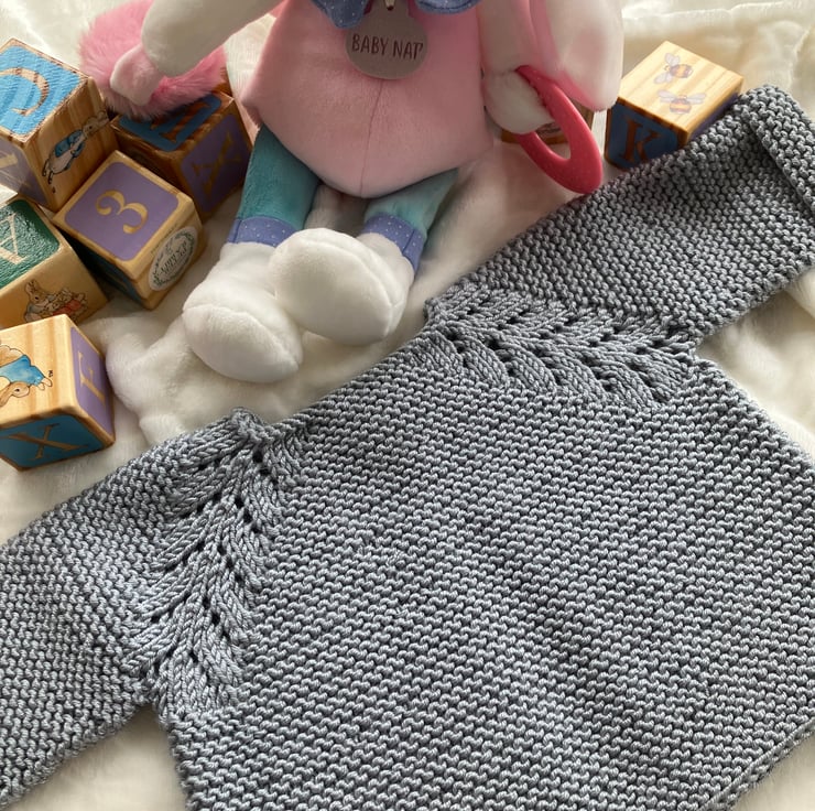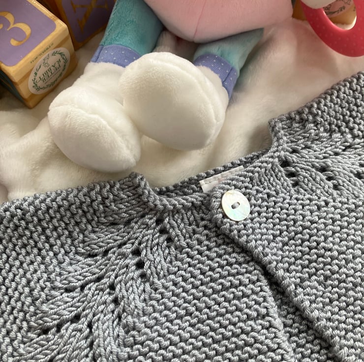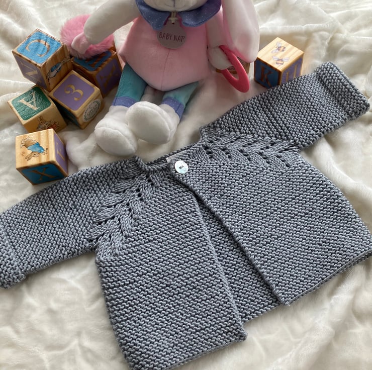 Hand-knitted baby girl’s cardigan to fit from 0-3 months. I have knitted this pretty little cardigan in a super soft and silky grey cotton yarn and finished it off with a mother of pearl button on the front fastening. The fir tree pattern on the sleeves gives added detail and the soft grey colour is very much on trend - a great addition to any girl’s wardrobe. Perfect for keeping your little one snuggly and warm on cooler days.