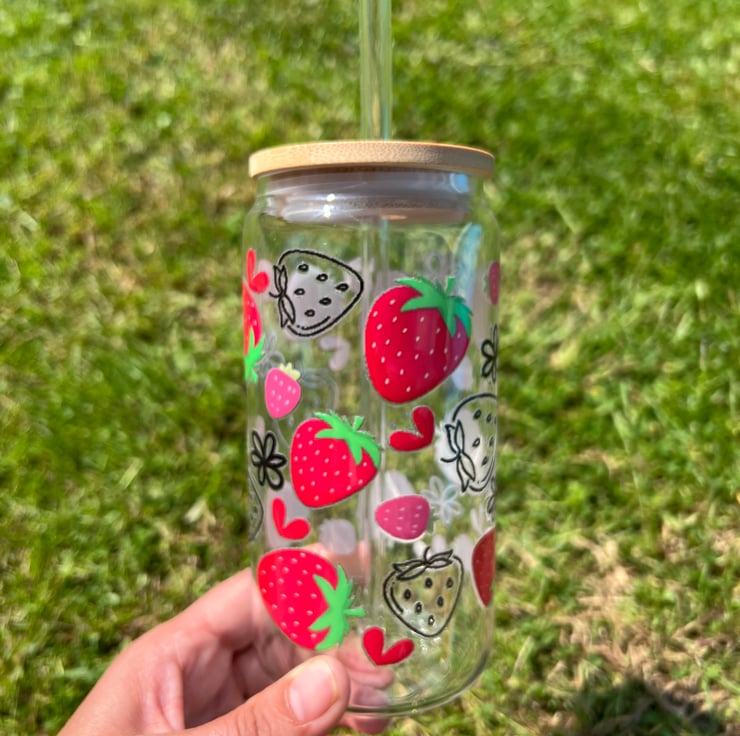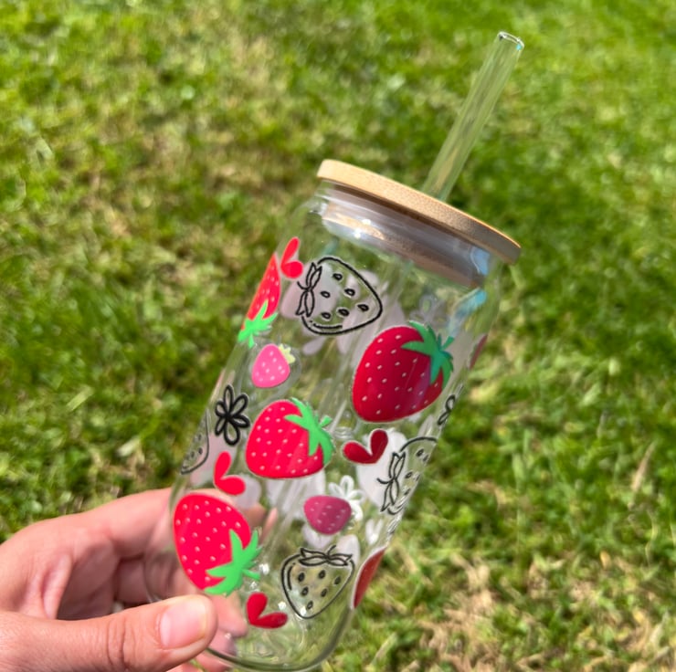 Introducing this stunning 16oz Handmade Clear Glass Strawberry themed glass tumbler perfect for all occasions! This beautiful tumbler is designed with the theme of summer.