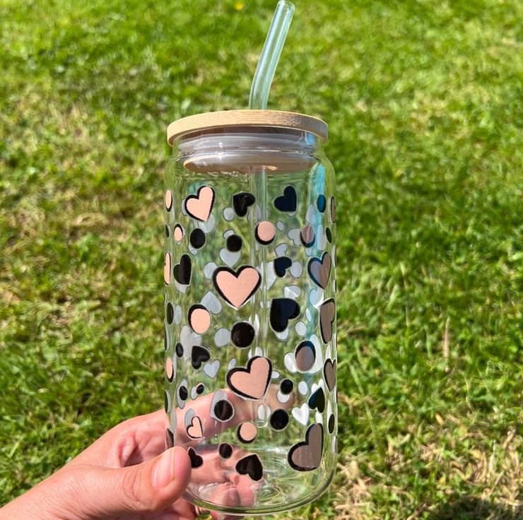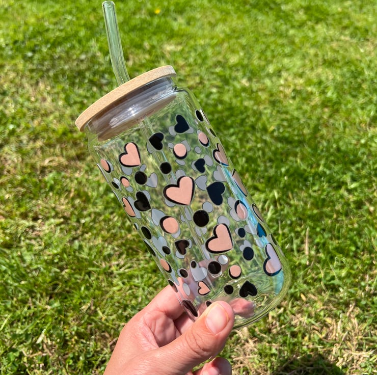 Introducing this stunning 16oz Handmade Clear Glam heart themed glass tumbler perfect for all occasions! This beautiful tumbler is designed with the theme of summer.