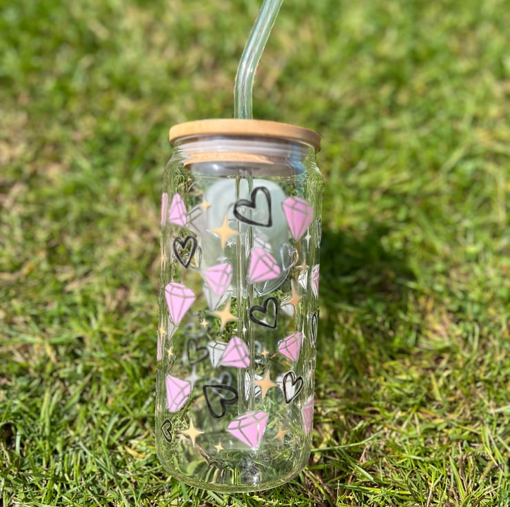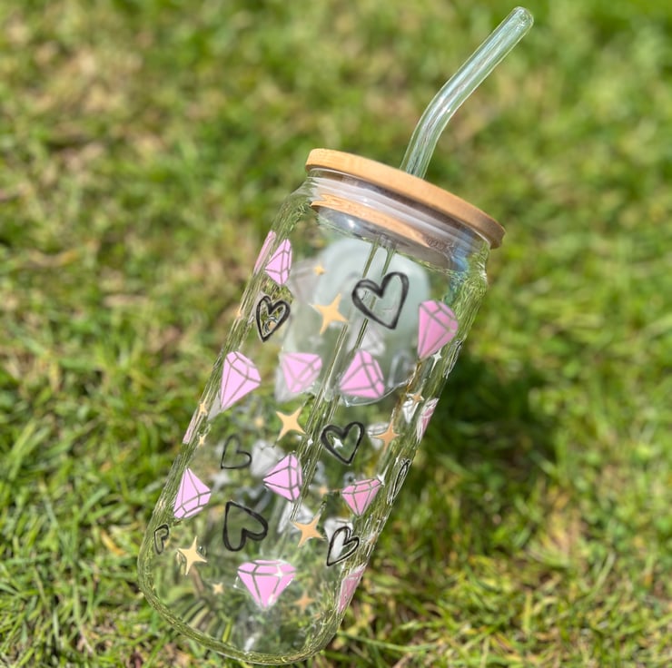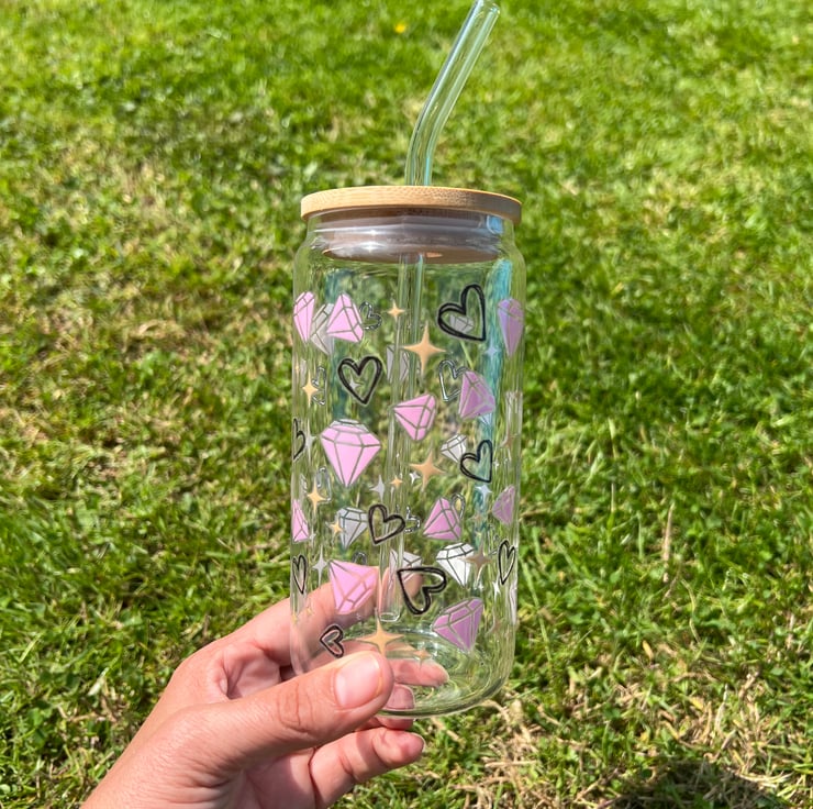Introducing this stunning 16oz Handmade Clear Glam heart themed glass tumbler perfect for all occasions! This beautiful tumbler is designed with the theme of summer.
