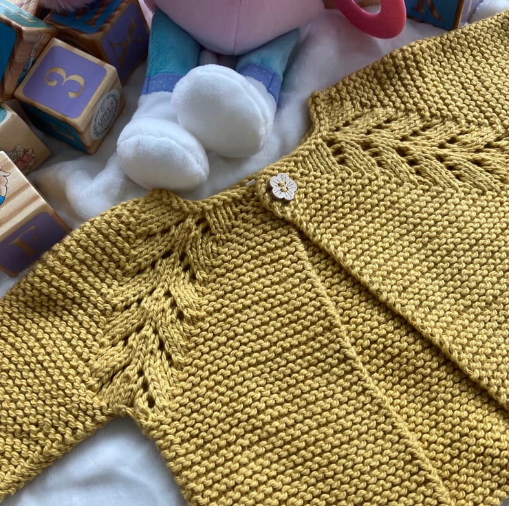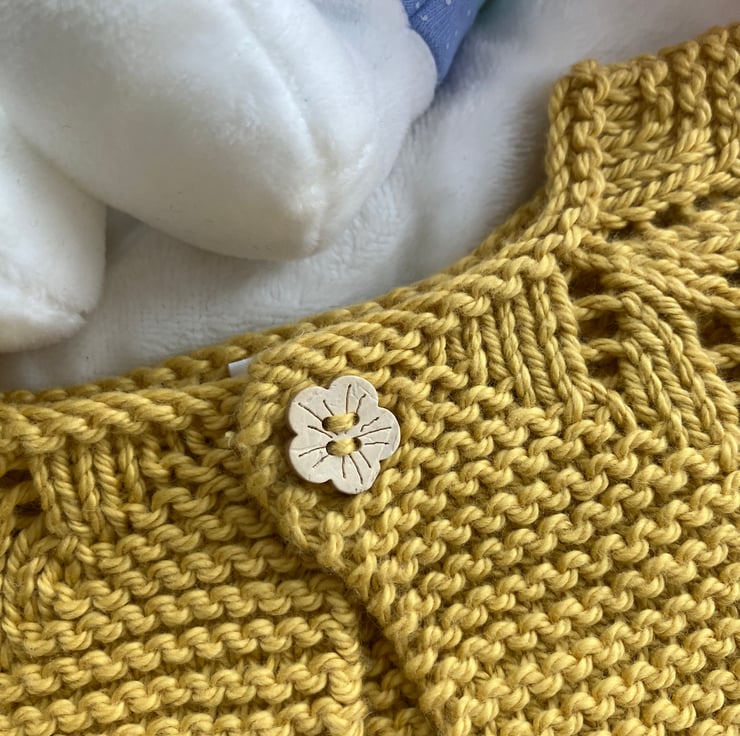 Hand-knitted baby girl’s cardigan to fit from 0-3 months. I have knitted this pretty little cardigan in a super soft ochre cotton yarn and finished it off with a flower shaped carved coconut shell button on the front fastening. The fir tree pattern on the sleeves gives added detail and the ochre colour is very much on trend - a great addition to any girl’s wardrobe. Perfect for keeping your little one snuggly and warm on cooler days.