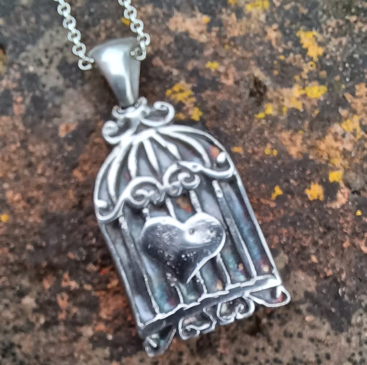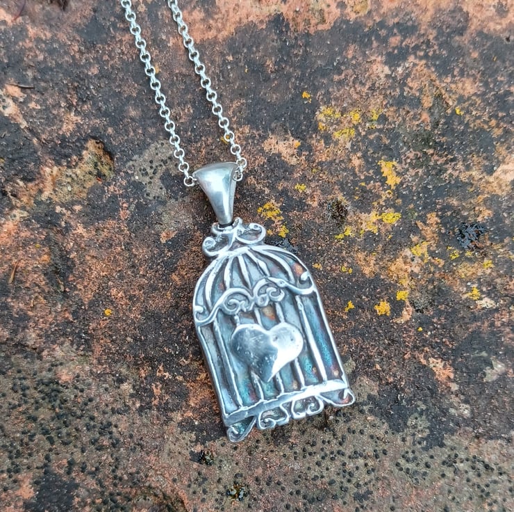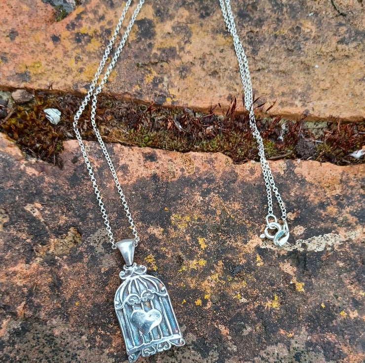 A pretty fine silver birdgage pendant (1.5cm x 3cm) hangs from a 46cm sterling silver chainn, which is fastened with a sterling silver bolt clasp.