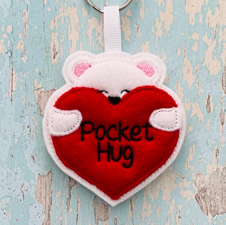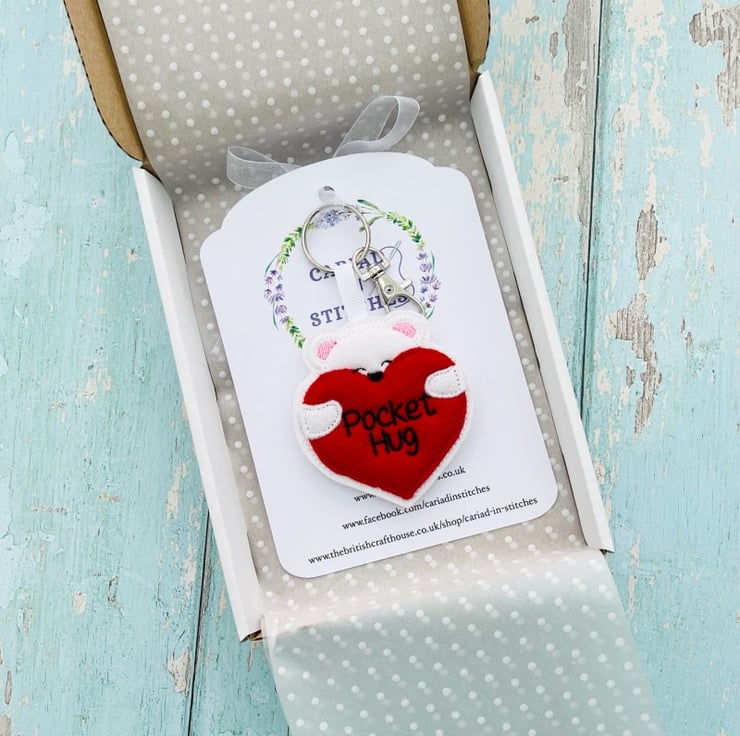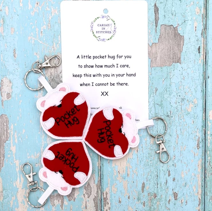 This cute little Bear holding a Heart is a lovely little gift to send to someone as a Hug to let them know you are thinking of them. It can be kept in a pocket or used as a keyfob.