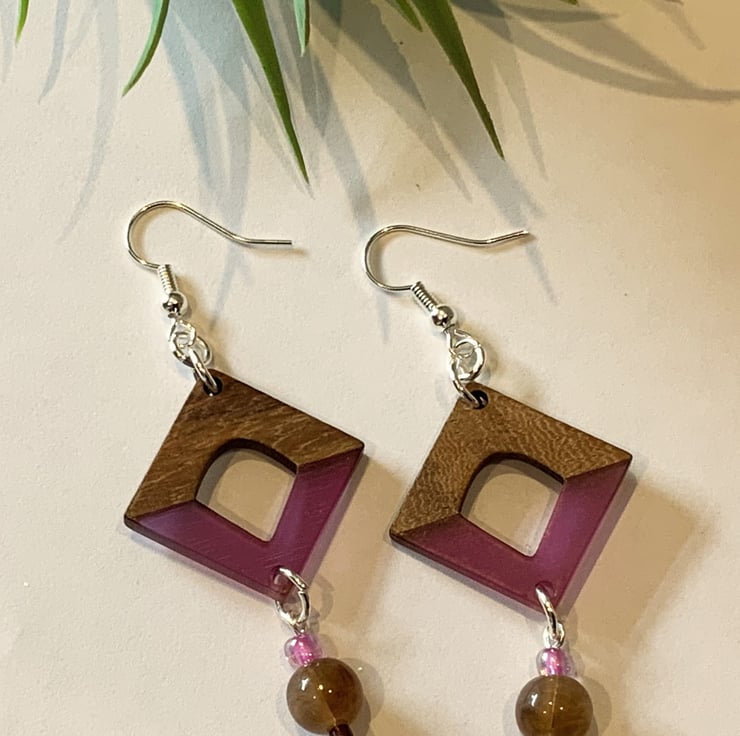 Rhombus design resin and walnut pendants in wood and magenta pink .