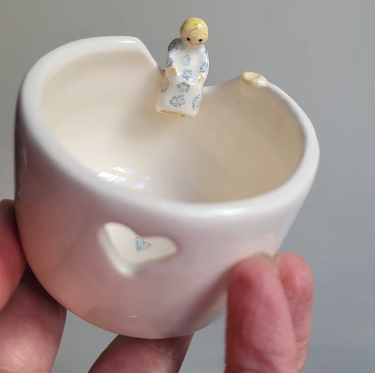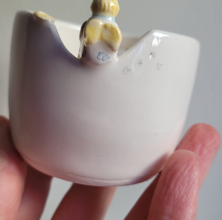 Hand made pot from a small ball of clay . Once trimmed, the tiniest of handmade angels was attached and foot prints added prior to bisque firing . The angel was then hand painted with tiny flowers and the whole pot dipped in clear lead free glaze prior to the final firing