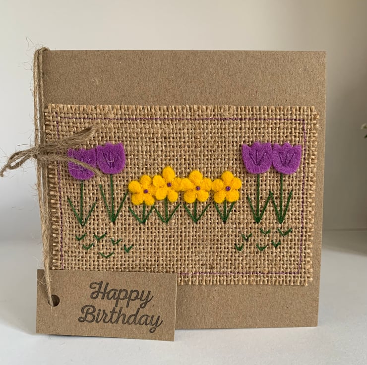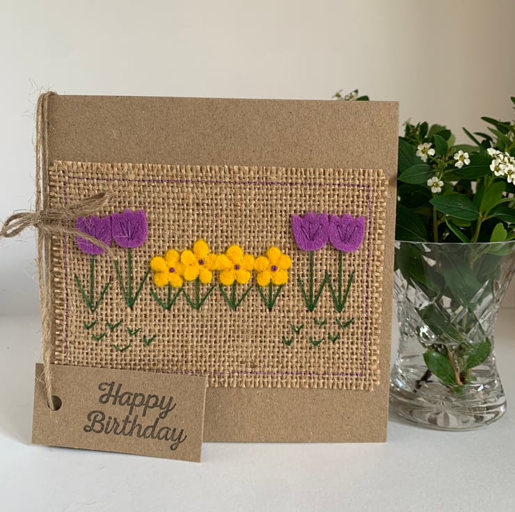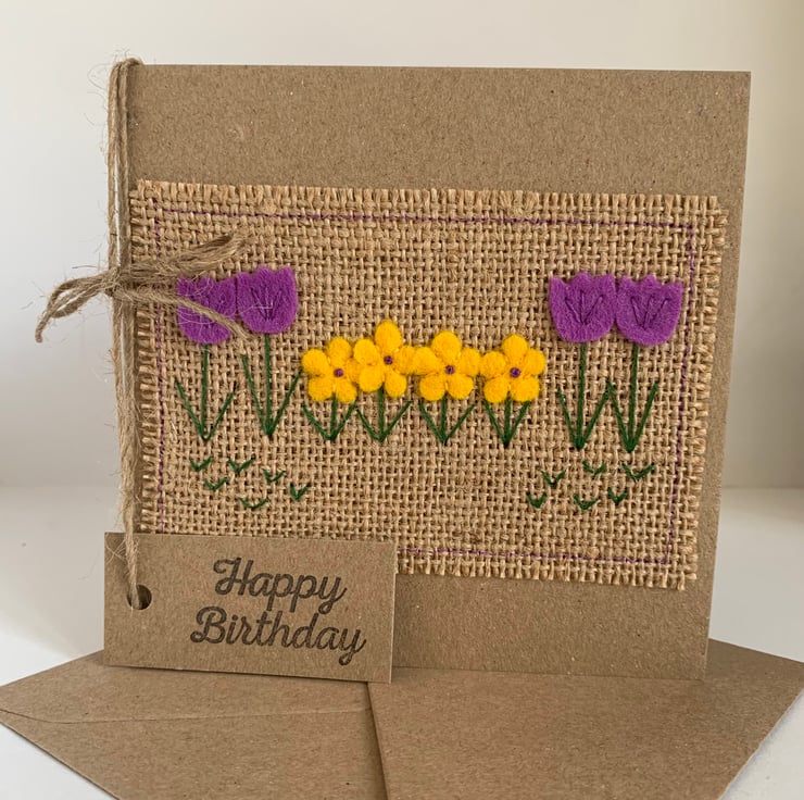 This unique handmade card is decorated with delicate flowers in purple and yellow. The decoration is hand cut from 100% wool felt. It is then sewn by hand onto a hessian background.