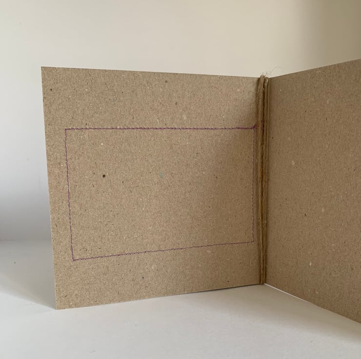 The hessian is machine stitched, using a contrasting thread, onto a plain brown recycled card. This stitching is visible on the inside of the card.