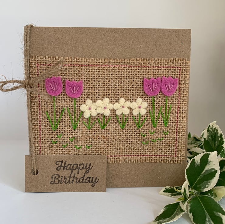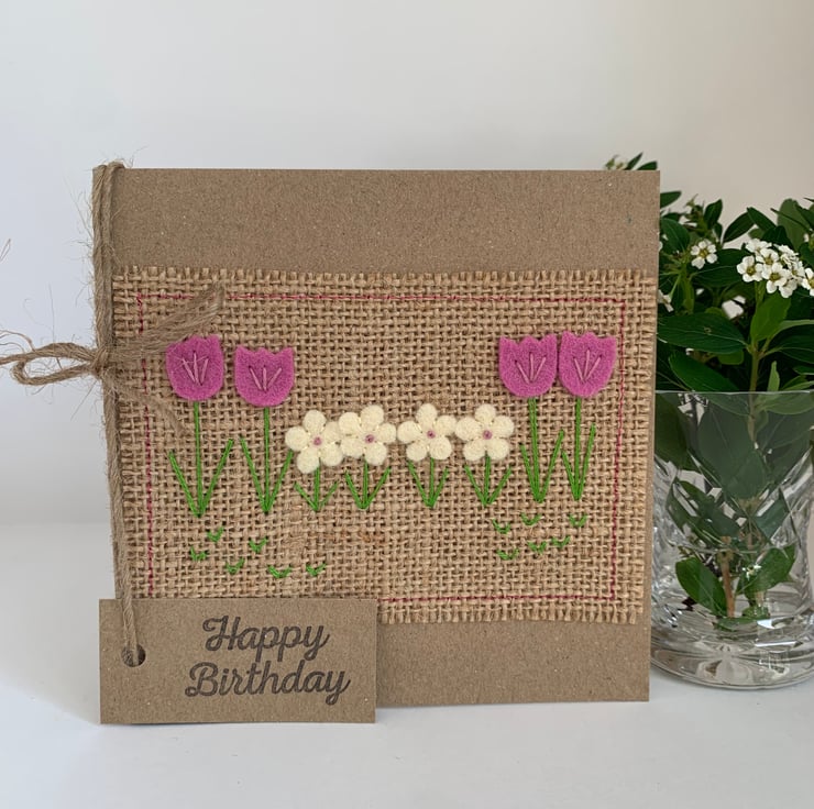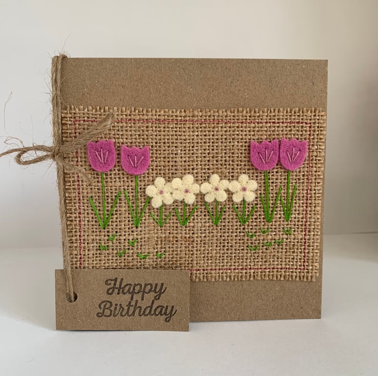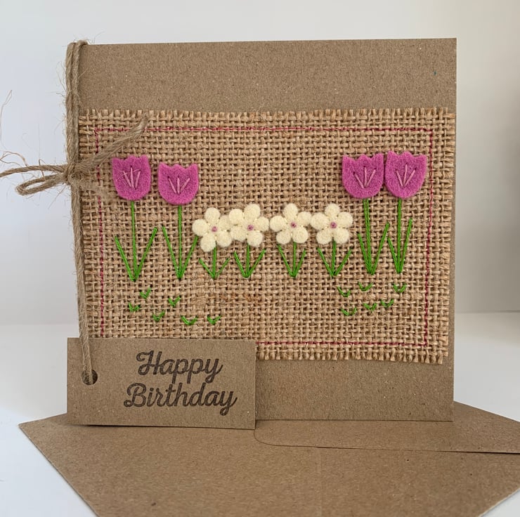 This unique handmade card is decorated with delicate flowers in rose pink and cream. The decoration is hand cut from 100% wool felt. It is then sewn by hand onto a hessian background.