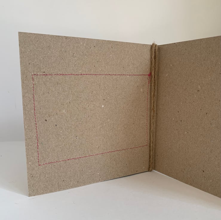 The hessian is machine stitched, using a contrasting thread, onto a plain brown recycled card. This stitching is visible on the inside of the card.