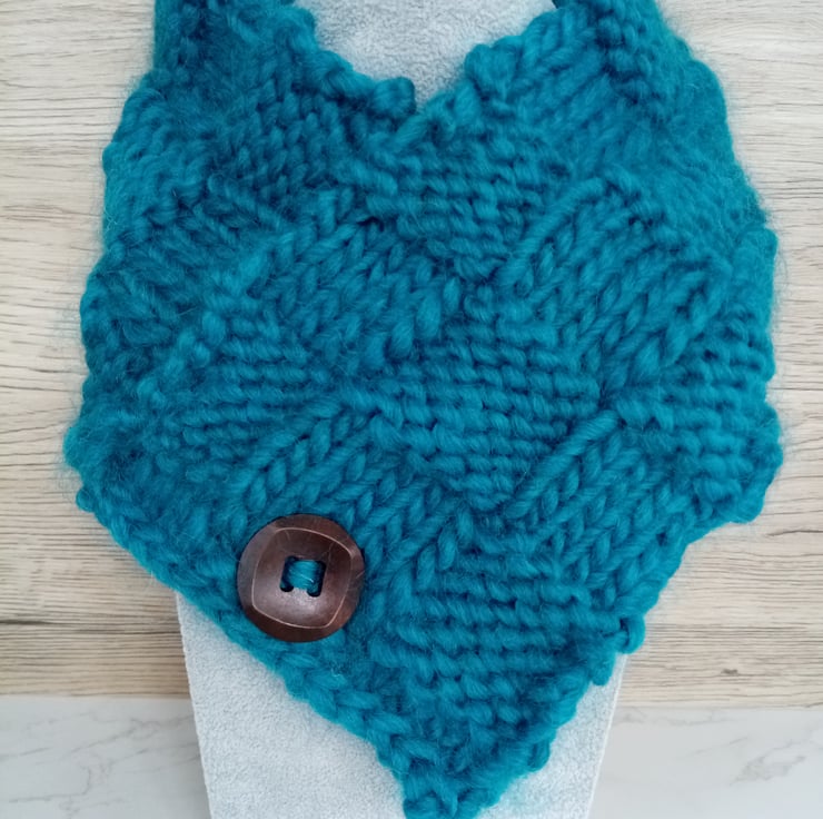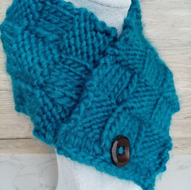 Silky soft basket weave style neck warmer in deep ocean green with chunky dark walnut button closing.