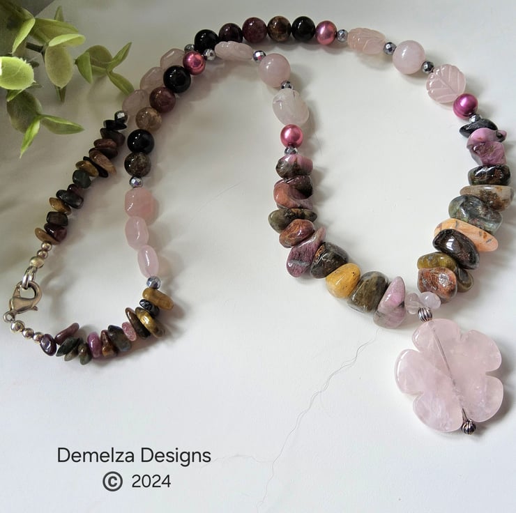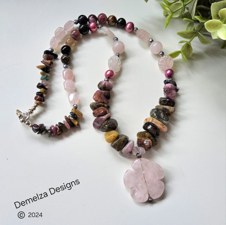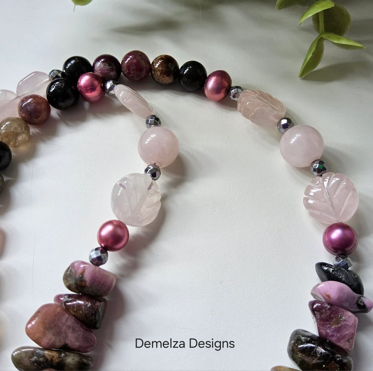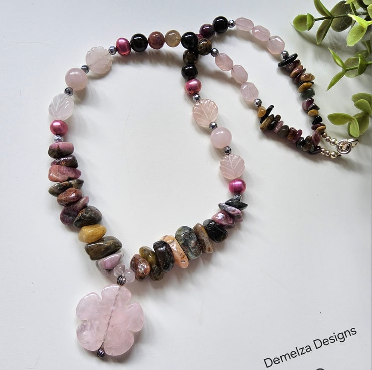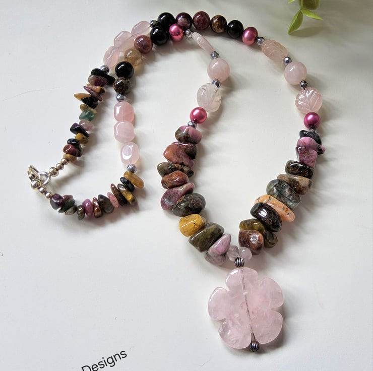 In the centre is a natural untreated large rose quartz flower measuring 3cm x 3cms. It sits between quality tumbled large genuine untreated tourmaline gemstone nuggets. Leading on are pink freshwater baroque pearls, hand carved rose quartz flat rounds, 10mm rose quartz rounds, 8mm tourmaline rounds, flat oval faceted rose quartz and finally medium tumbled tourmaline. Within the design are silver coated heamotite faced gemstones and silver plated spacer beads.