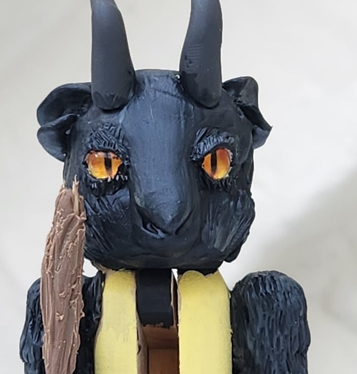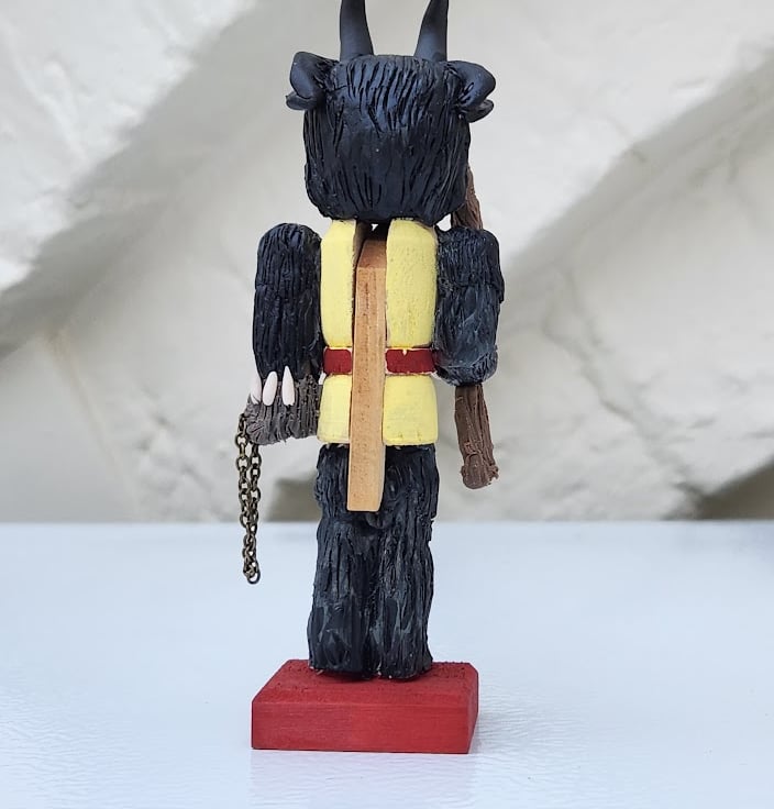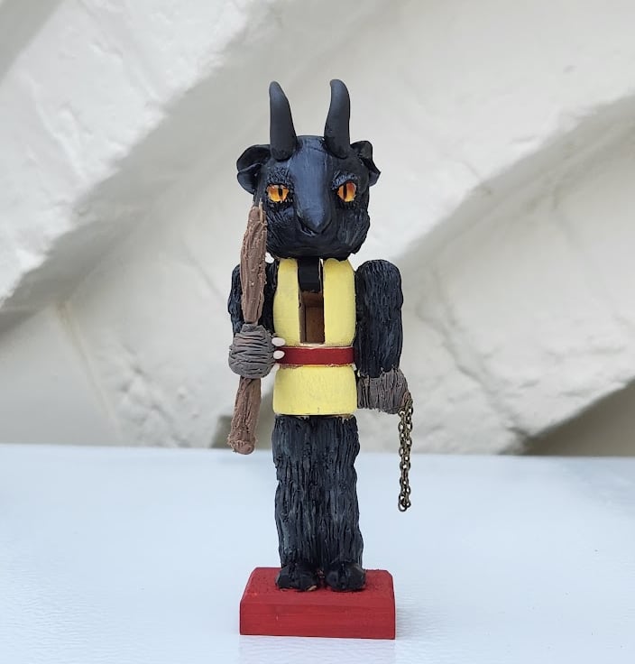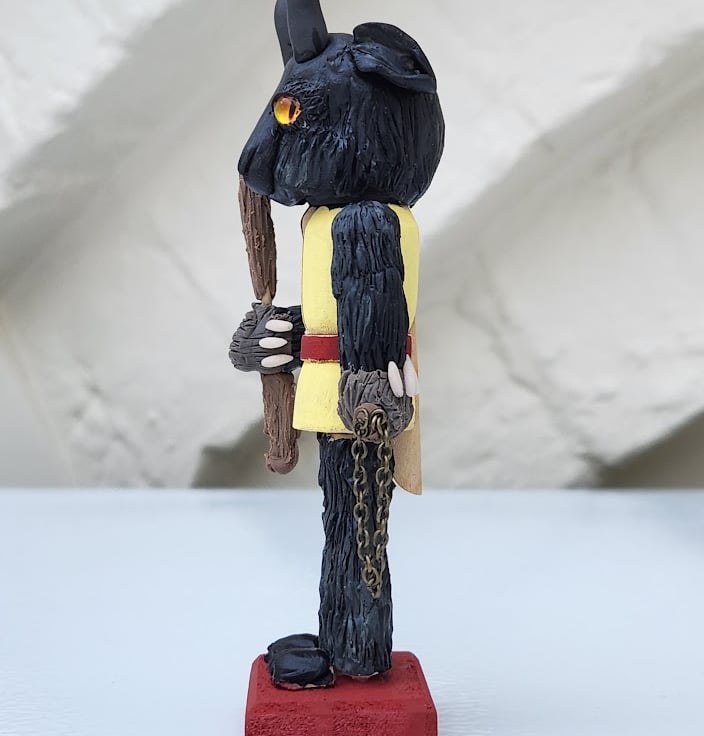 Measuring 12cm, This nutcracker is made of wood, polymer clay, glass ( eyes), resin and acrylic paint.. The glass eye cab produces the effect of the Krampus looking straight forward as well as to the side when turned.