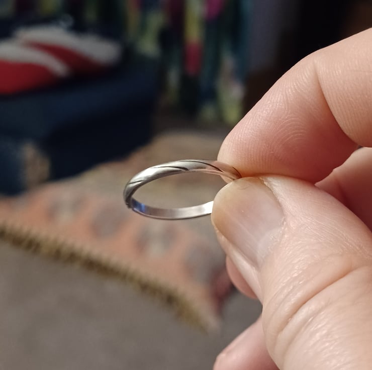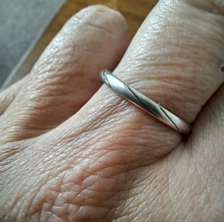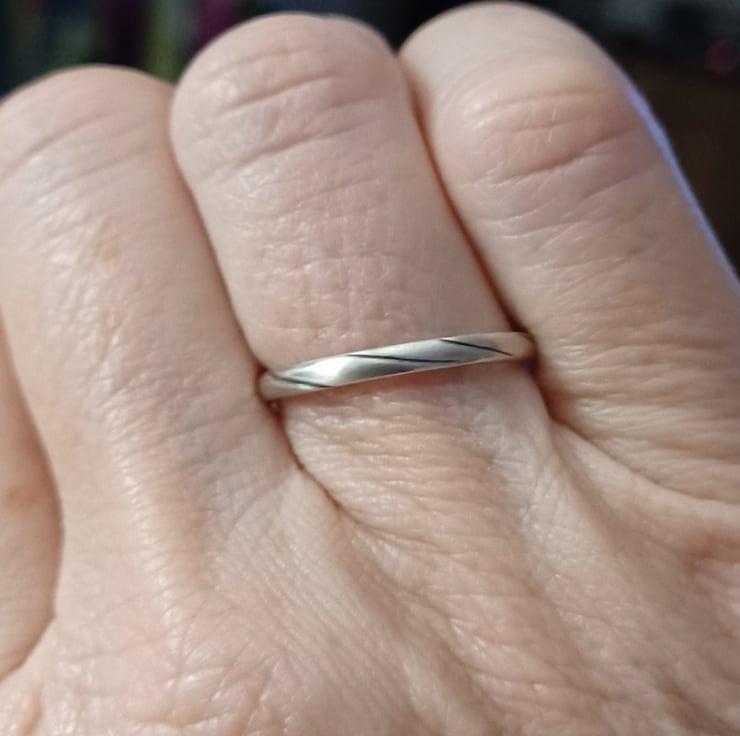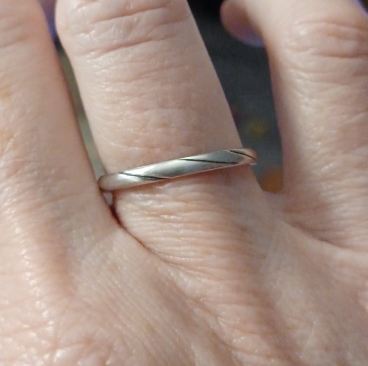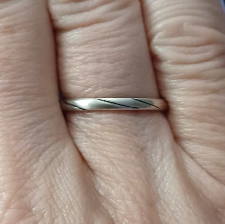 A stylish silver ring with a simple diagonal engraved pattern. The ring is 2mm wide and a UK size T1/2 (US 10; 62.1mm)