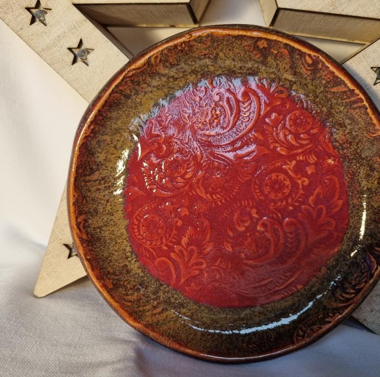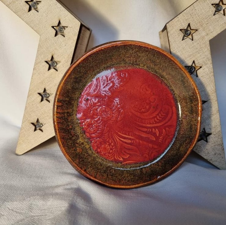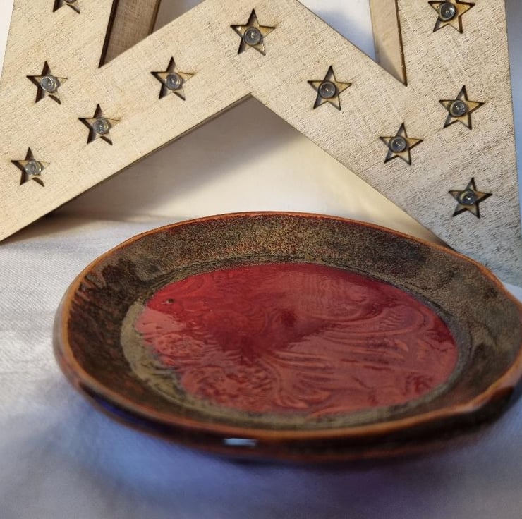 Handmade Small round ceramic trinket dish . Could be used as trinket dish or as a small dish for nibbles. Each Dish is slightly different due to reaction of glazes. Each one is made by hand by me in my home studio in the Welsh Valleys and therefore each one is unique. After the first firing, each dish is brushed with at least 3 layers of glaze before firing again.