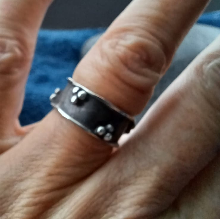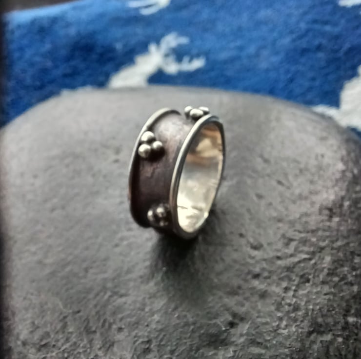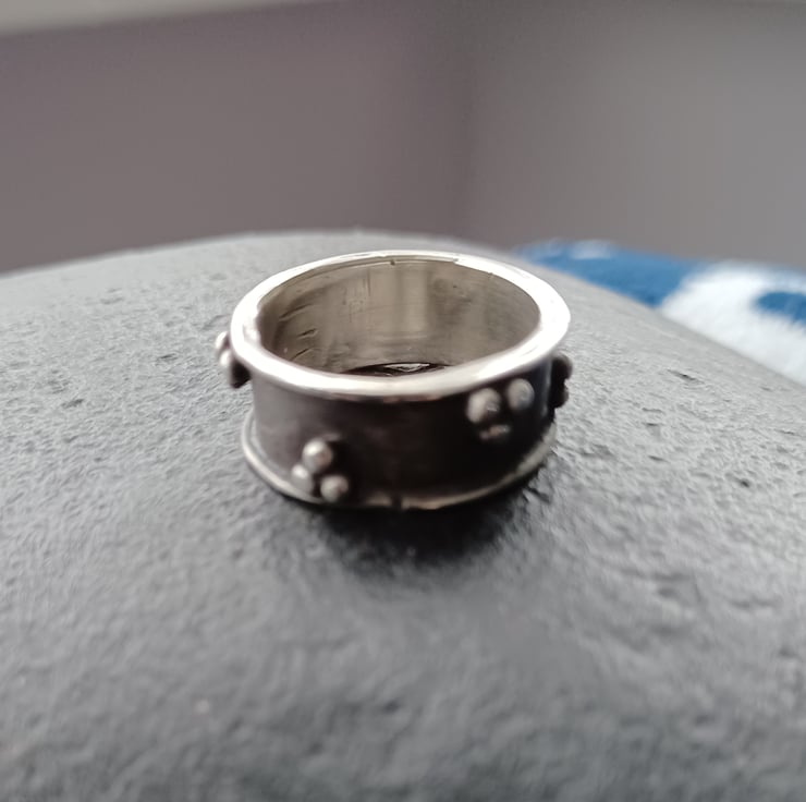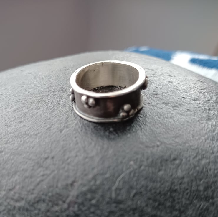 A stylish oxidised sterling silver band ring with sets of three silver bobbles around its perimeter. The ring is 8mm wide and a UK size N (US 6.75; 53.1mm)