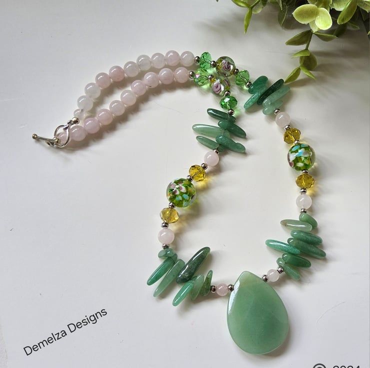 The necklace consists of a central large faced pear cut green adventure measuring 4cm x 3.5cms complimented with irregular cut toothed green aventurine gemstones. Within the design are 8mm round natural rose quartz gemstones, murano glass beads, floral hand blown beads and faceted yellow and green crystal beads. The necklace has quality silver plated beads for added sparkle providing an opulent looking finish without the heafty price tag seen in independent boutique jewellery shops or other on line jewellery websites.