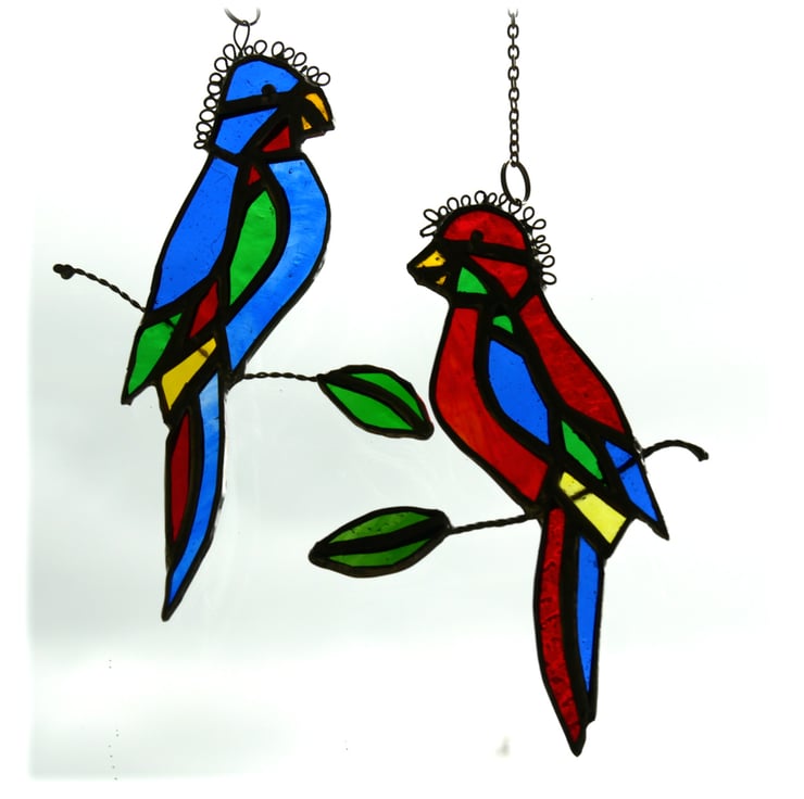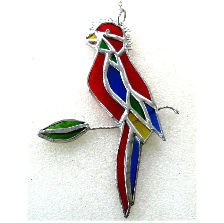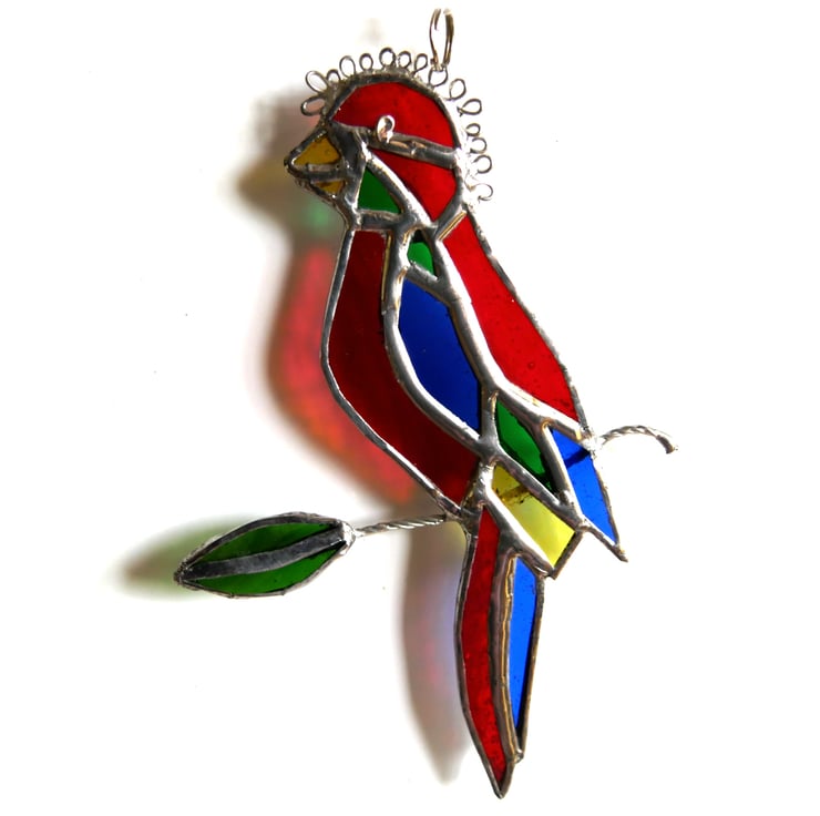 A dramatically coloured parrot, mainly bright red but with some green, yellow and blue feathers. I've added little curly feathers to the top of the parrot's head to be quirky and also to provide a very safe and secure hanging spot.