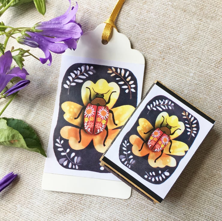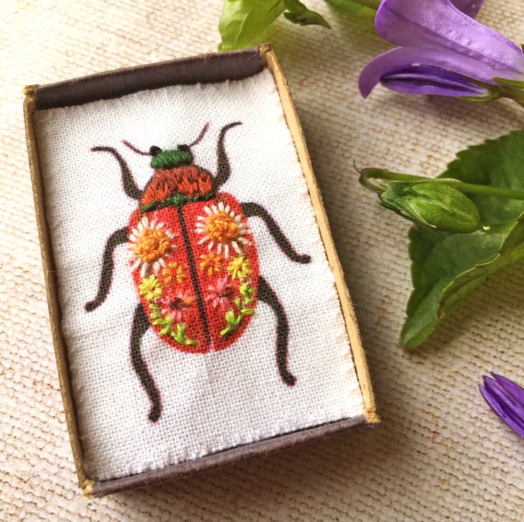 This pretty bug in a box would make a quirky little gift or keepsake. It has been made using an upcycled vintage matchbox and inside is a textile print of a beetle which I've embroidered with tiny flowers.