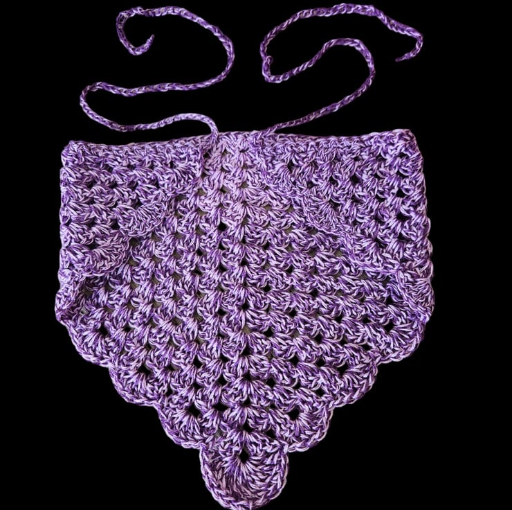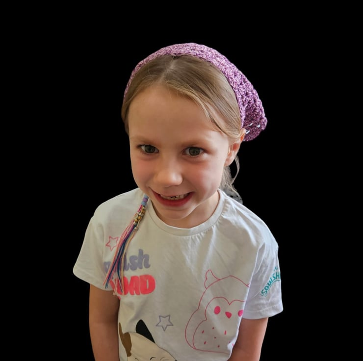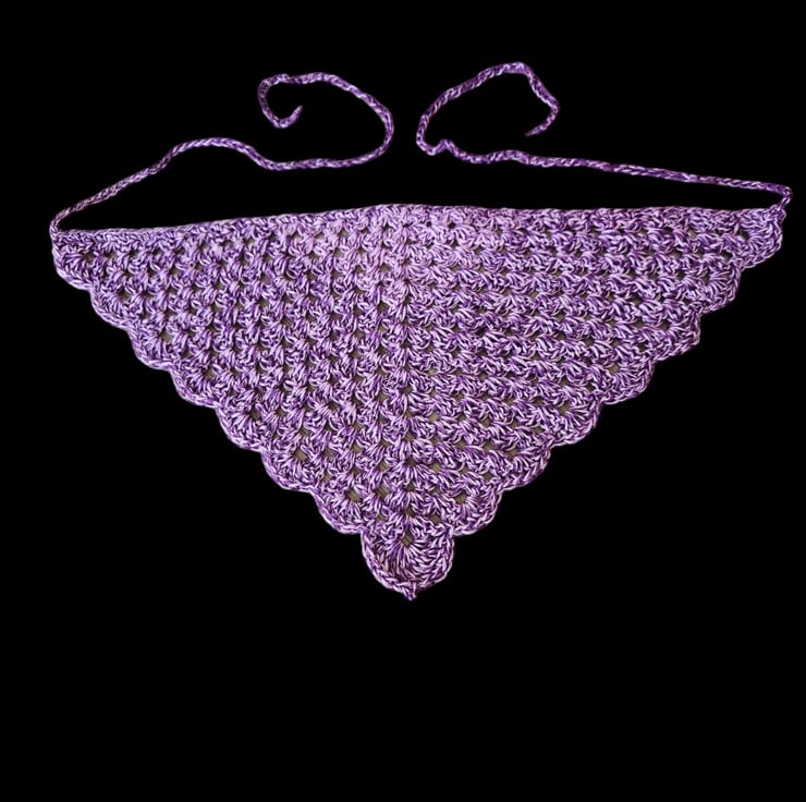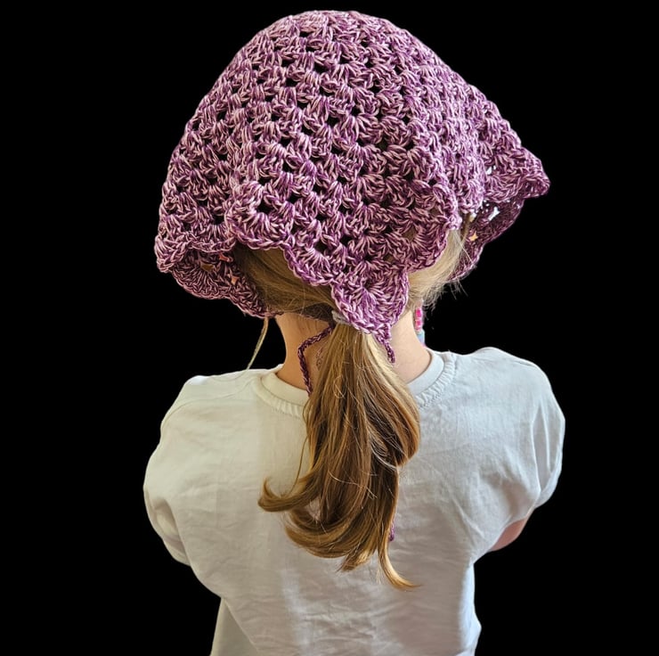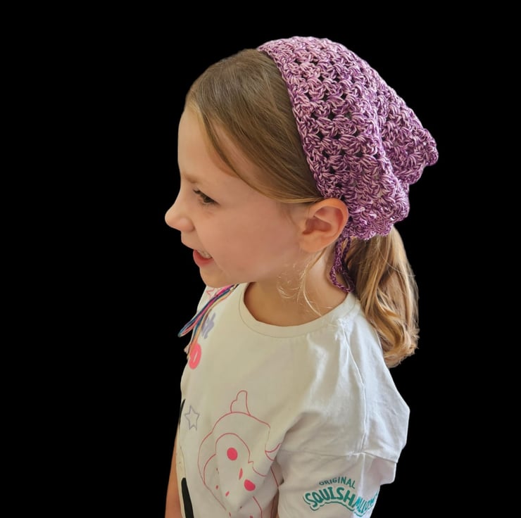 This charming bandana is designed for a girl approximately 3-6 years old. It's crafted from a blend of cotton and acrylic yarn, which ensures a beautiful drape and is machine washable. The delightful combination of pink and purple hues is simply stunning.