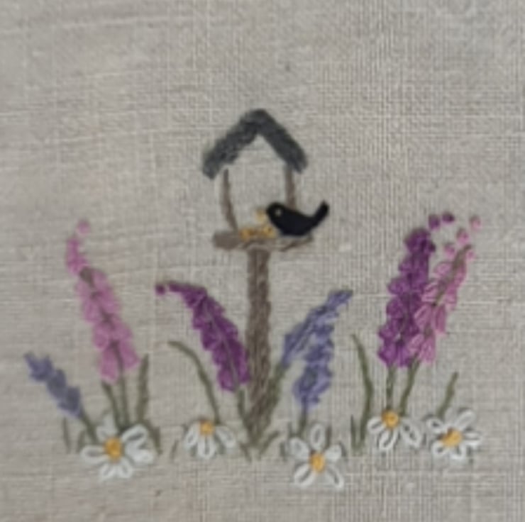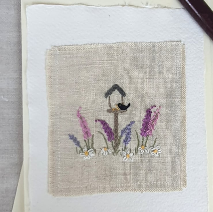 More than a card! Hand embroidered on vintage linen and mounted on a piece of handmade paper on a blank card for your own message. Ideal for when you want to give more than a card as this beautiful card can be framed afterwards.