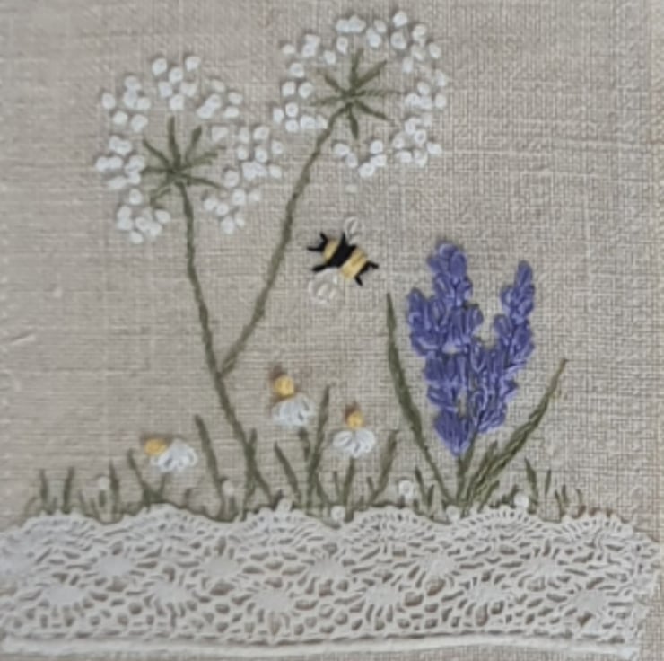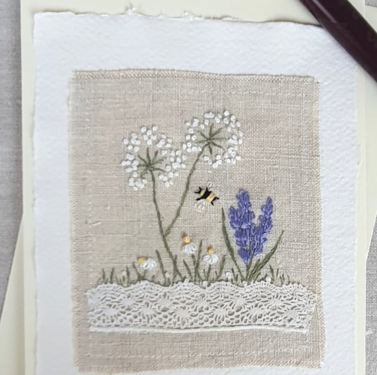 More than a card! Hand embroidered on vintage linen and mounted on a piece of handmade paper on a blank card for your own message. Ideal for when you want to give more than a card as this beautiful card can be framed afterwards.