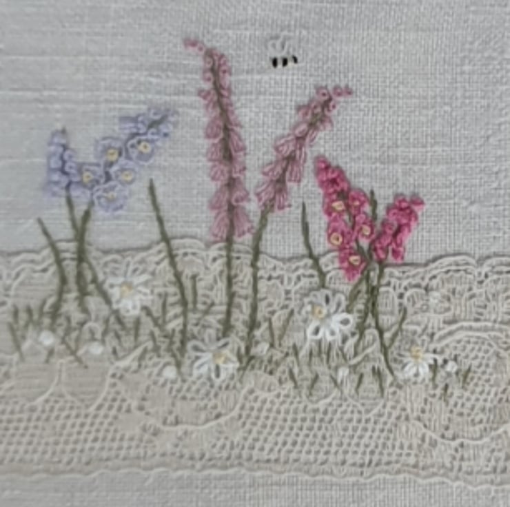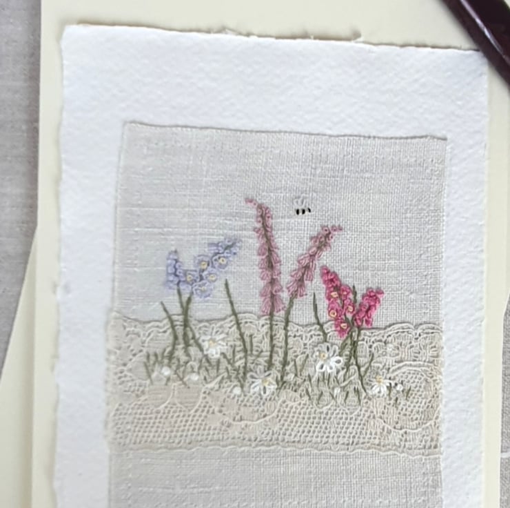 More than a card! Hand embroidered on vintage linen and mounted on a piece of handmade paper on a blank card for your own message. Ideal for when you want to give more than a card as this beautiful card can be framed afterwards.