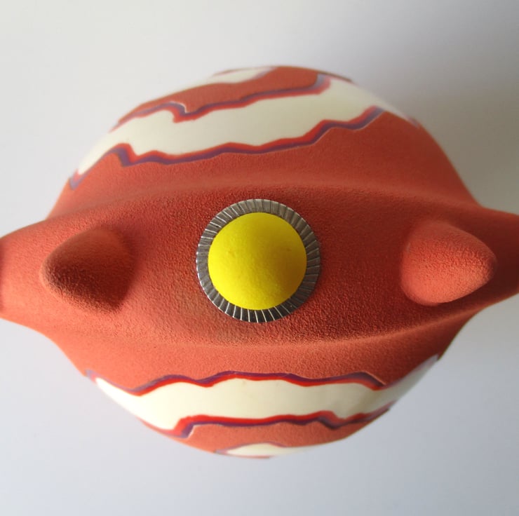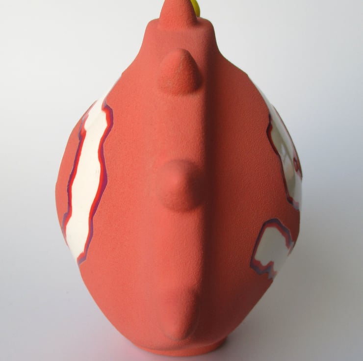 Spiky vase with spiral design. The spiral is done with glossy red, purple and cream glazes and contrasts nicely with my own matte textured glaze, painted in a terracotta colour. It has a little yellow stopper.