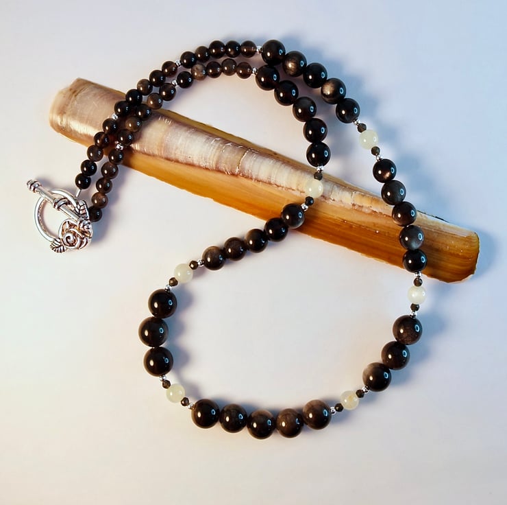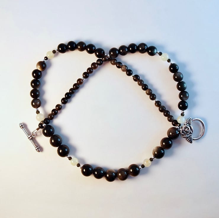 Silver Sheen Obsidian necklace, set with 5mm Moonstones highlighted with tiny, 2mm faceted Obsidian and sterling silver beads.