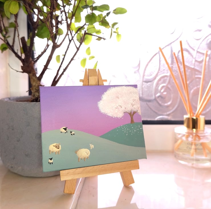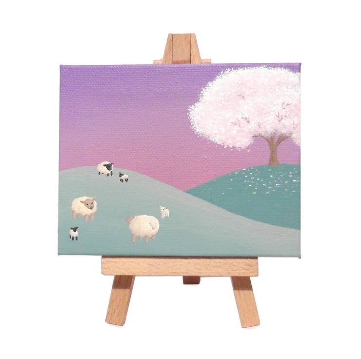 Spring Landscape Mini Painting - sheep and lamb art with cherry blossom tree