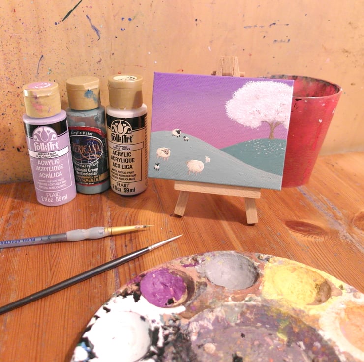 This spring landscape is painted in acrylics on an 8cm x 10cm (3.2" x 4") mini canvas and is signed and dated on the back. The small size makes this art perfect for those that don't have much room, as it can easily fit on a narrow windowsill, shelf or other small space, such as to bring a relaxing view to your desk.