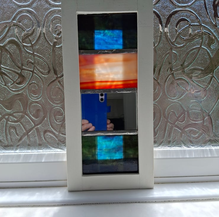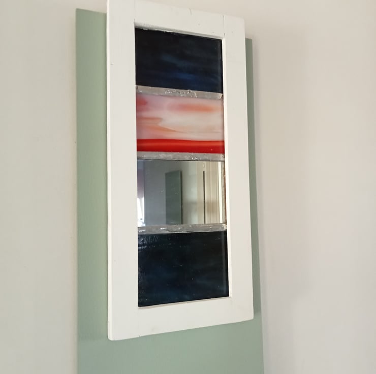 'Sunset' is a stained glass and wood wall panel with inset mirror in rich blues and reds. H 32cm x W 15cm. The pine wood frame is painted in Farrow and Ball All White. The panel is designed to hang on a wall but can also be placed in front of a window. It has a fixed brass hanging loop.