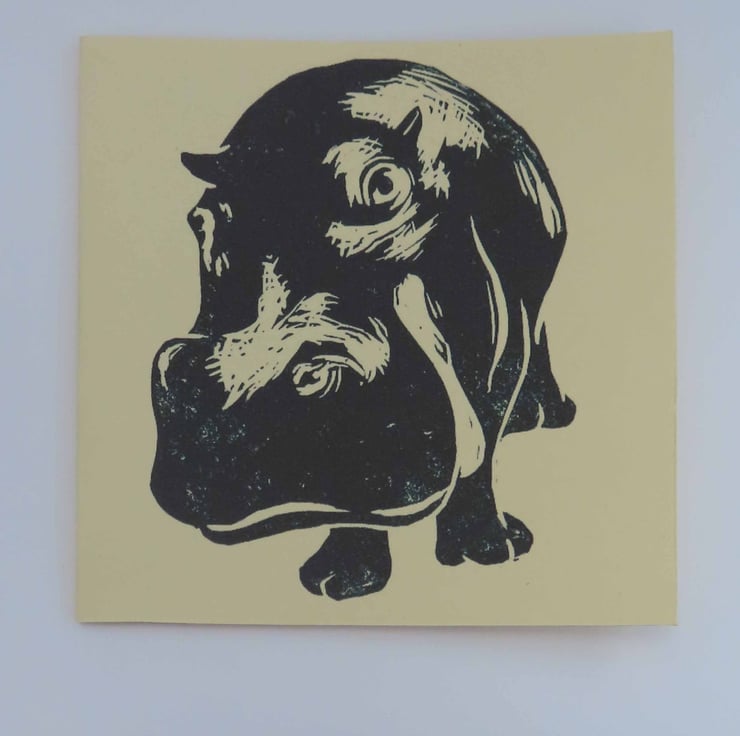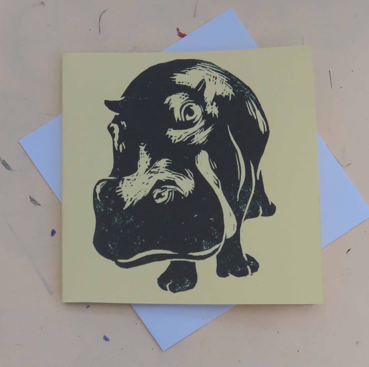 Blank greeting card reproduced from my original lino cut print Hippo