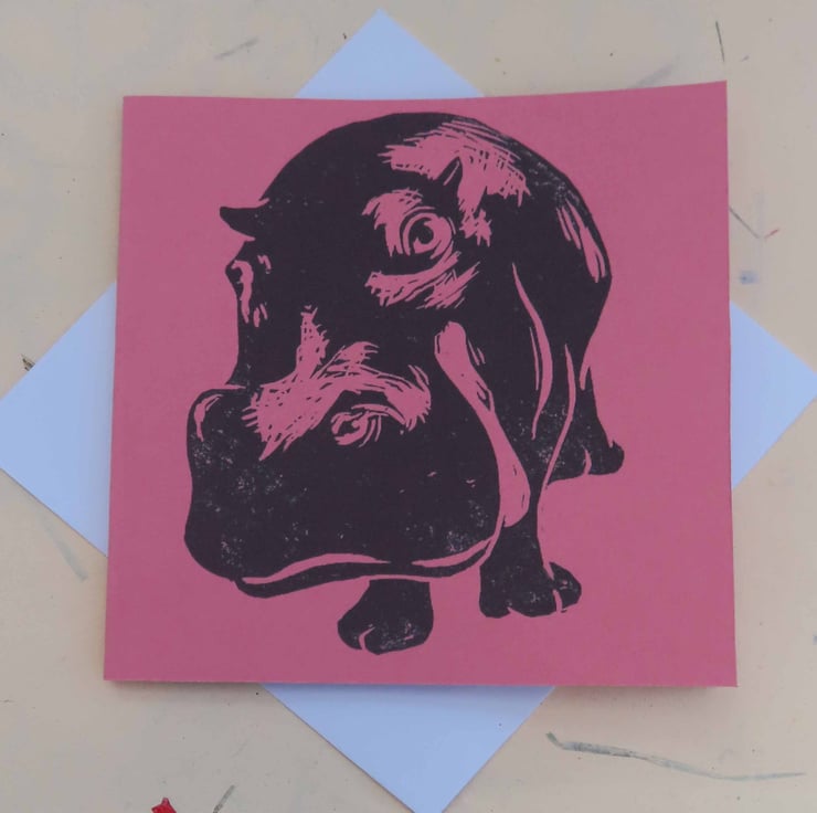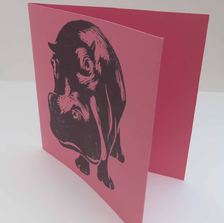 Hippo Art Greeting Card From Original Lino Cut Print Pink