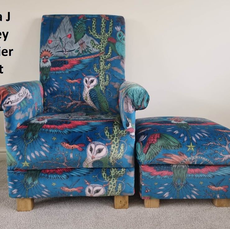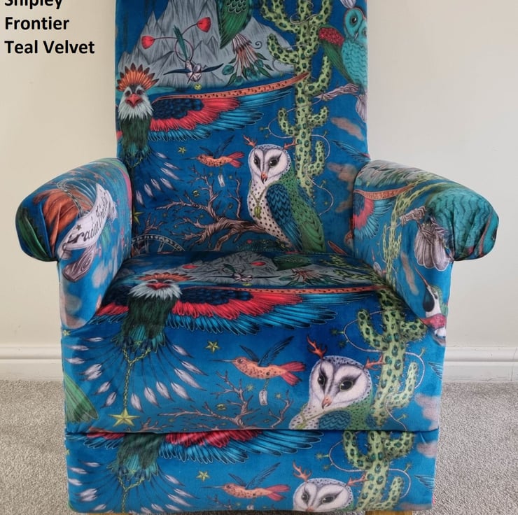 This is a fully assembled, handcrafted, sturdy ADULT'S arnchair, which has been made myself. I am a professional upholsterer with over 33 years experience, and have made this sturdy little chair and matching footstool, using Emma Shipley Frontier Velvet fabric in Teal.