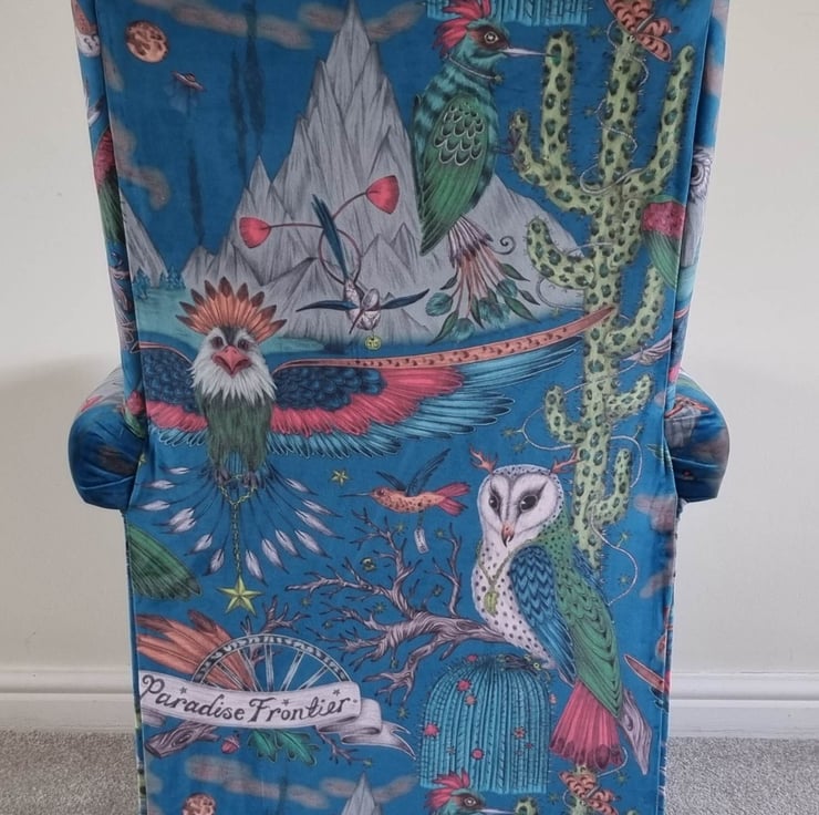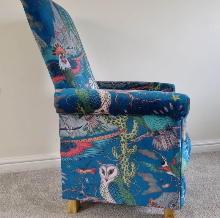 This lovely adult's armchair measures approximately 36 inches in height, by 26 inches wide and will look gorgeous in any room, and is a real accent piece of furniture. It has a wooden frame and has a fire retardant interliner, which makes it compliant with UK fire regulations. It is then upholstered entirely with this gorgeous fabric, and has solid wooden feet.