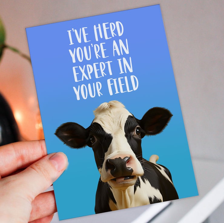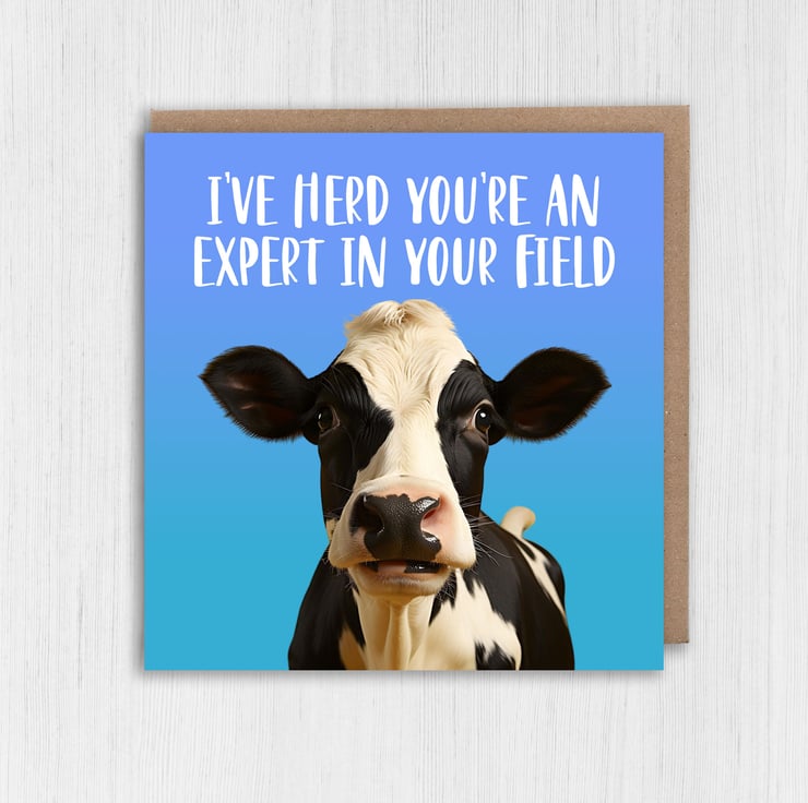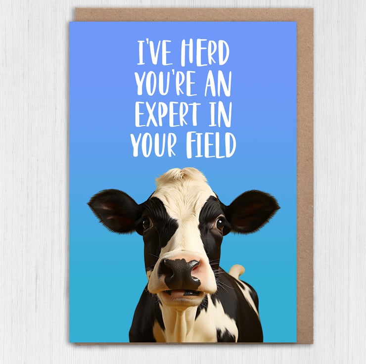I've herd you're an expert in your field funny cow, farm animal, pun congratulations, graduation, well done card (Size A6/A5/A4/Square 6x6")