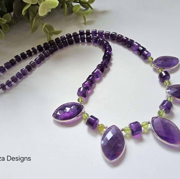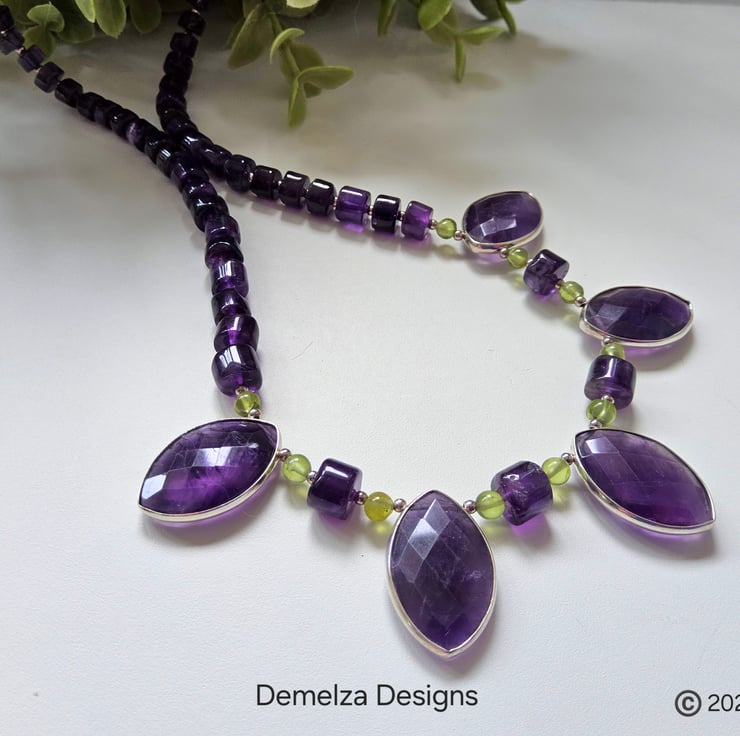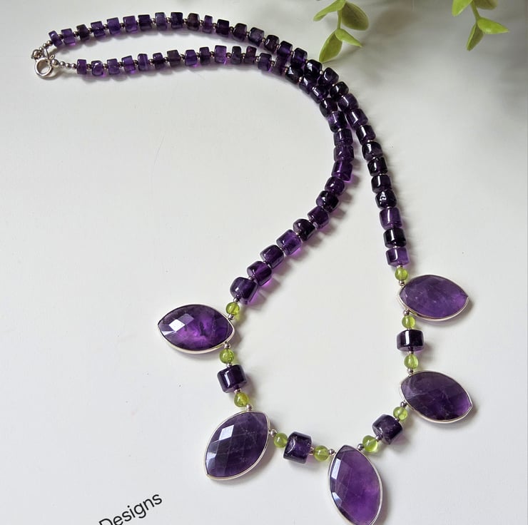 The five faceded amethyst drops have 925 sterling silver edging around them and between each amethyst gemstone drop is a 925 sterling silver 2mm spacer bead with 4mm peridot rounds adding a distinctive designer look. This is a 'one off'' item so no other person will have a necklace the same, unlike mass produced gemstone jewellery available in high street jewellery chain stores.